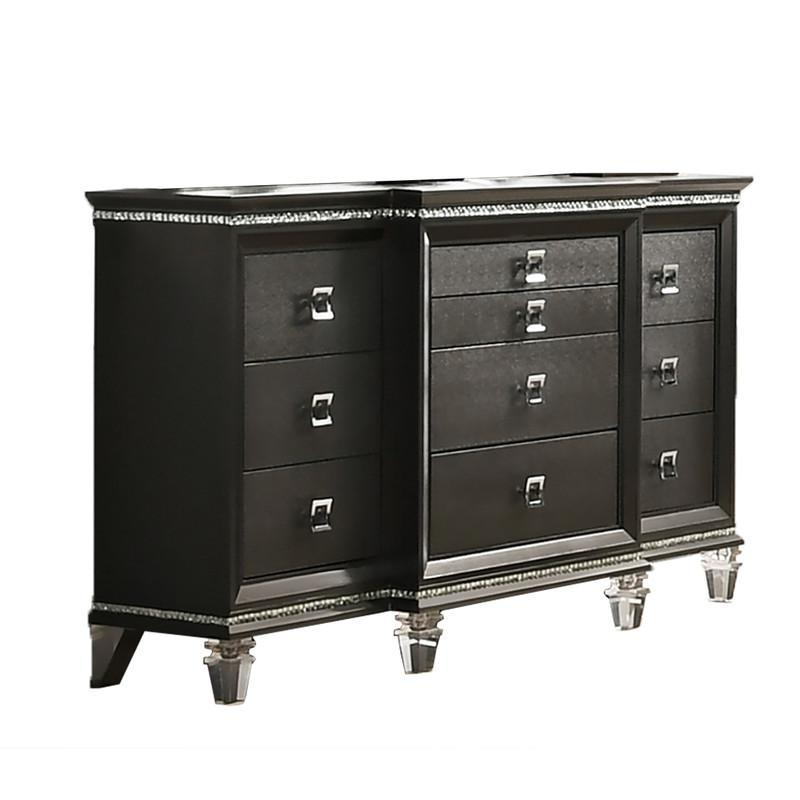 This bed room set comes with: 1 Platform Bed, 1 Night Stands, and 1 Dresser. The bed has tufted buttons, and 2 drawers and acrylic legs. The whole bed set has acrylic legs and square knobs. This bedroom set is perfect for a simplistic look.