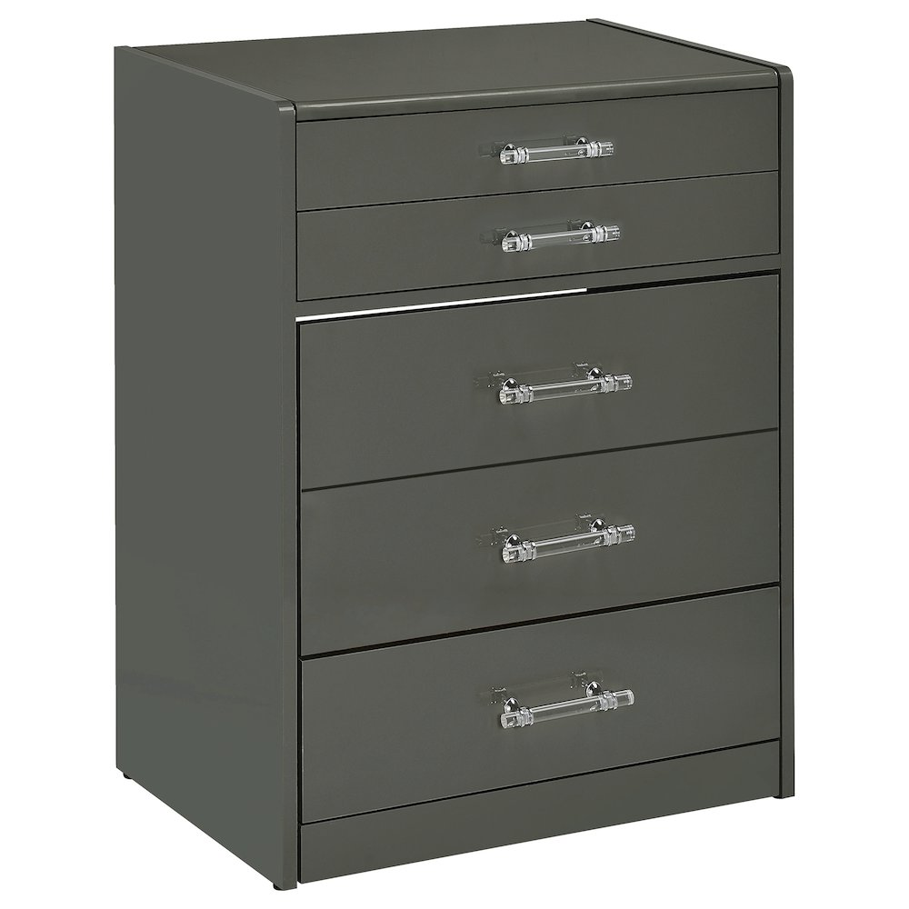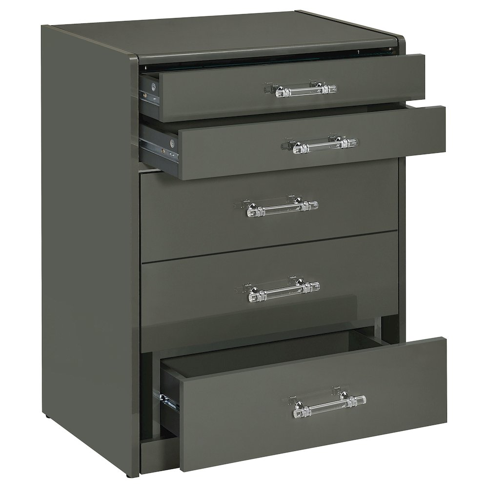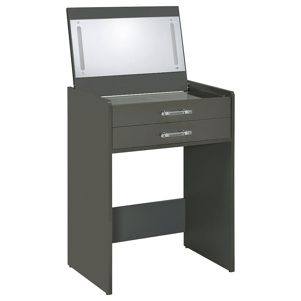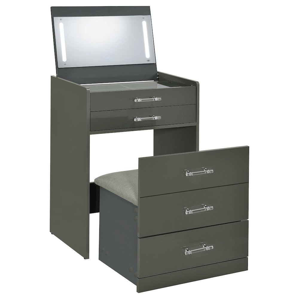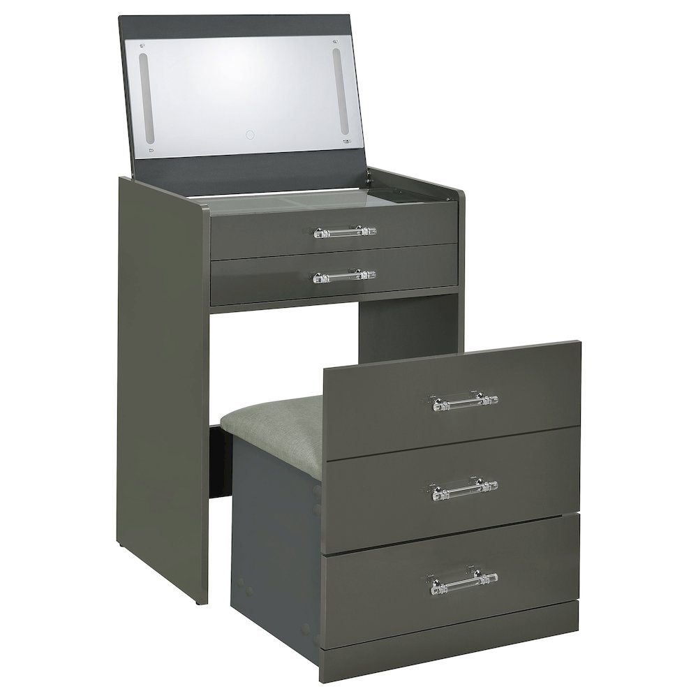 Grey high gloss makeup vanity set crafted from engineered wood with eco-friendly laminate Flip-top mirror with LED lighting for bright, even illumination Built-in dual USB outlet with Type A and Type C ports for convenient device charging Clear glass tabletop reveals a compartmentalized drawer for organized storage Clear acrylic with chrome pull handles add a modern, elegant touch