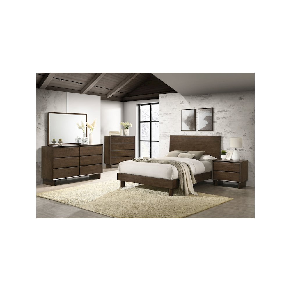Clean, straightforward design details bring stylish flair to a modern bedroom set Crafted from solid wood in a warm brown finish A platform headboard is tall and solid, complete with sharp square corners for a handsome look Top drawers include felt lining in a dark brown color, adding protection for delicate items Drawers feature English dovetail joinery and metal glides for excellent performance