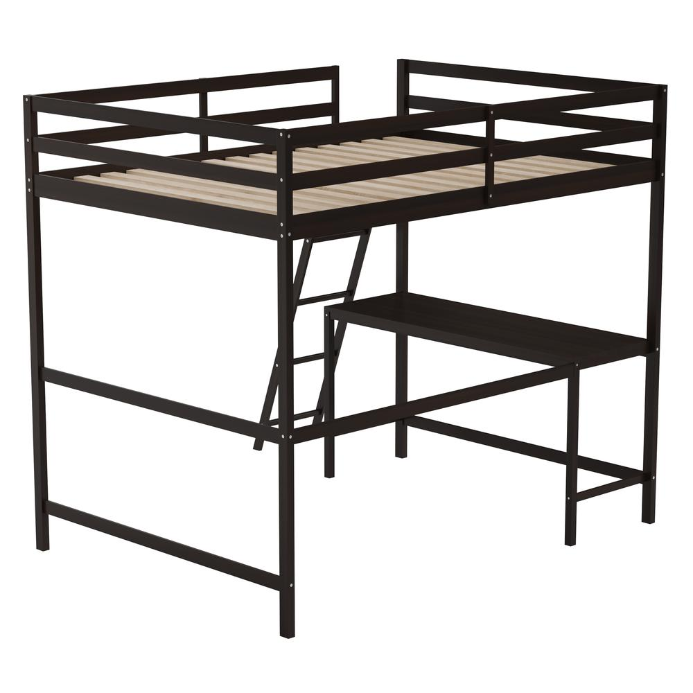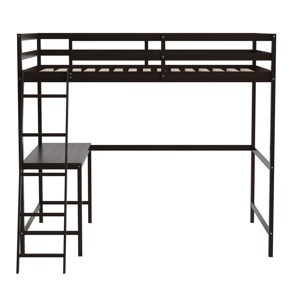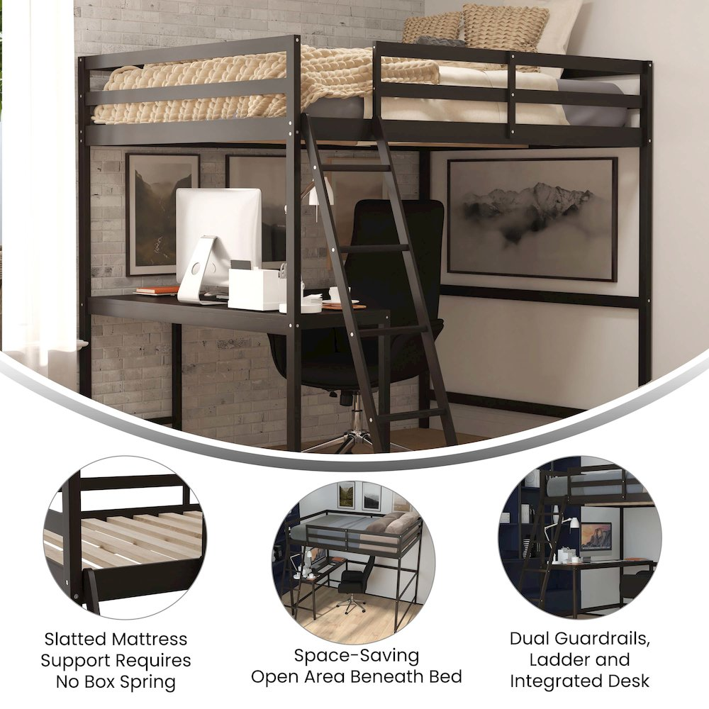 Traditional Style Full Size Loft Bed Frame with Desk for Children Teens and Adults Wooden Slat Design in Espresso Finish Dual Guardrails Designed for Use with 6" - 8" Mattresses Slatted Mattress Support with No Box Spring Required Integrated Ladder and 56"W x 18.75"D Built-In Desk Constructed with Wood Screws and Wood Dowels and Holds up to 300 LBS. Static Weight Space-Saving Open Area Under Bed for Storage or Play Clean with a Dry Cloth Assembles in 60 Minutes or Less with Included Materials 0