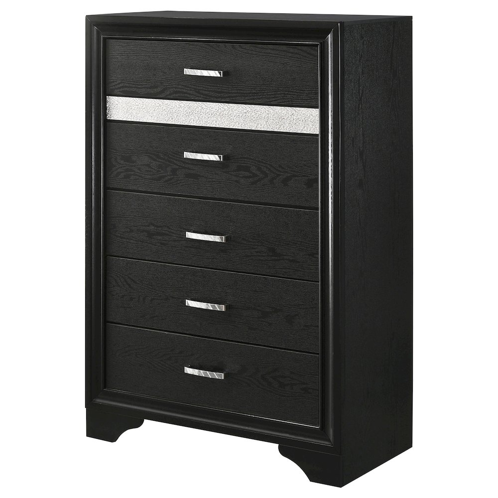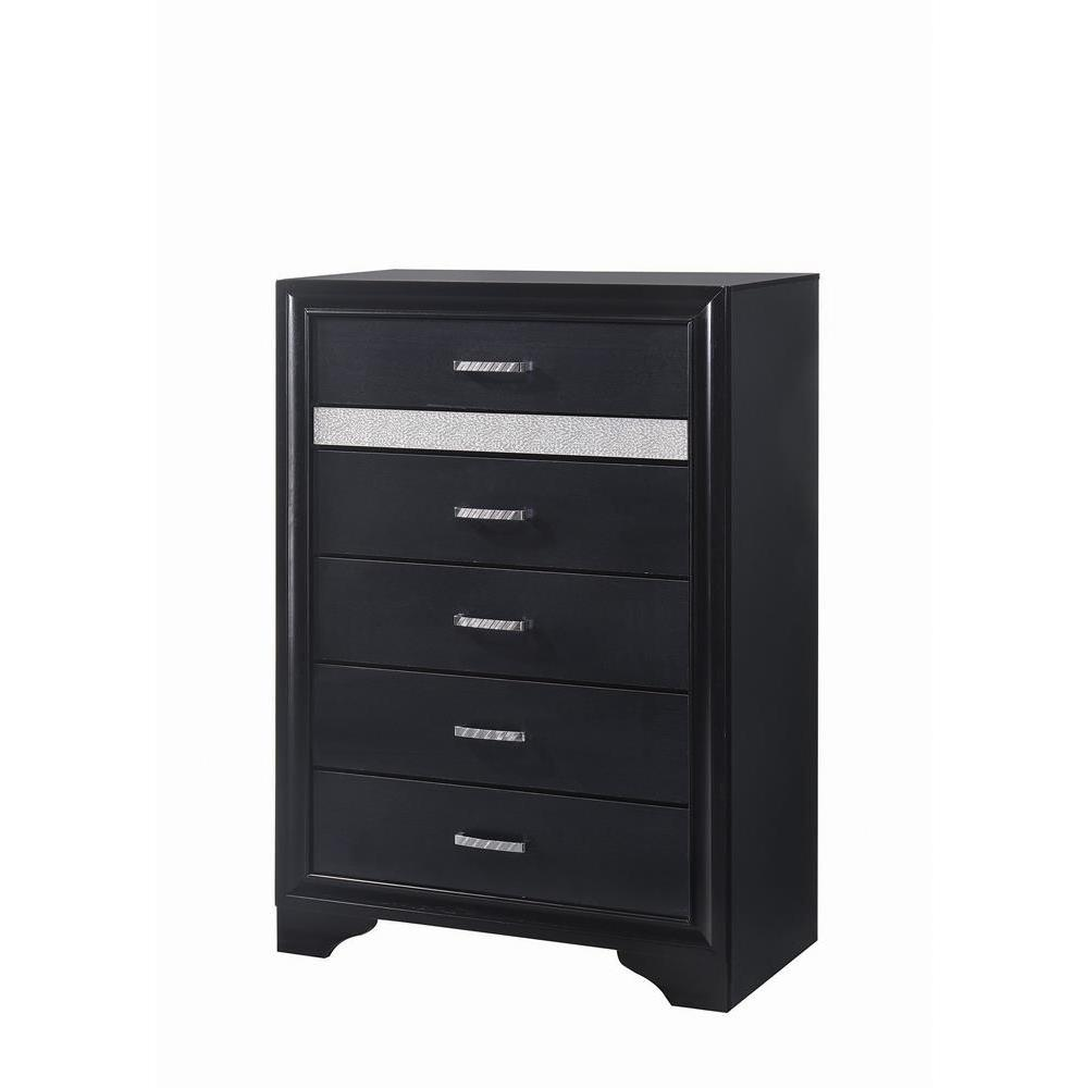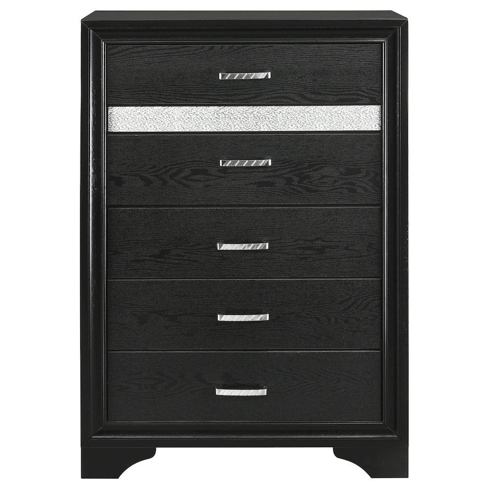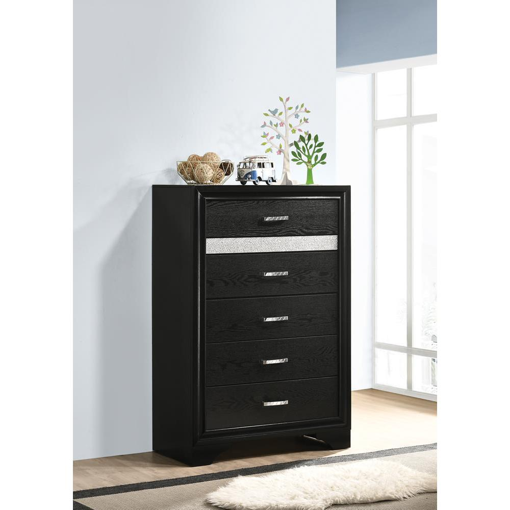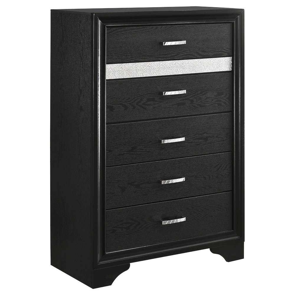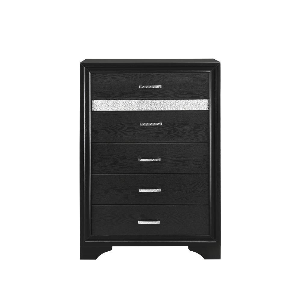 Glittering stripes add energy to a contemporary design with glamorous at the forefront Elegant and timeless design with just the right amount of "bling" Chest and dresser have hidden felt-lined drawers to protect your jewelry Exclusive rhinestone pull handles set this collection apart Available in white and black finish