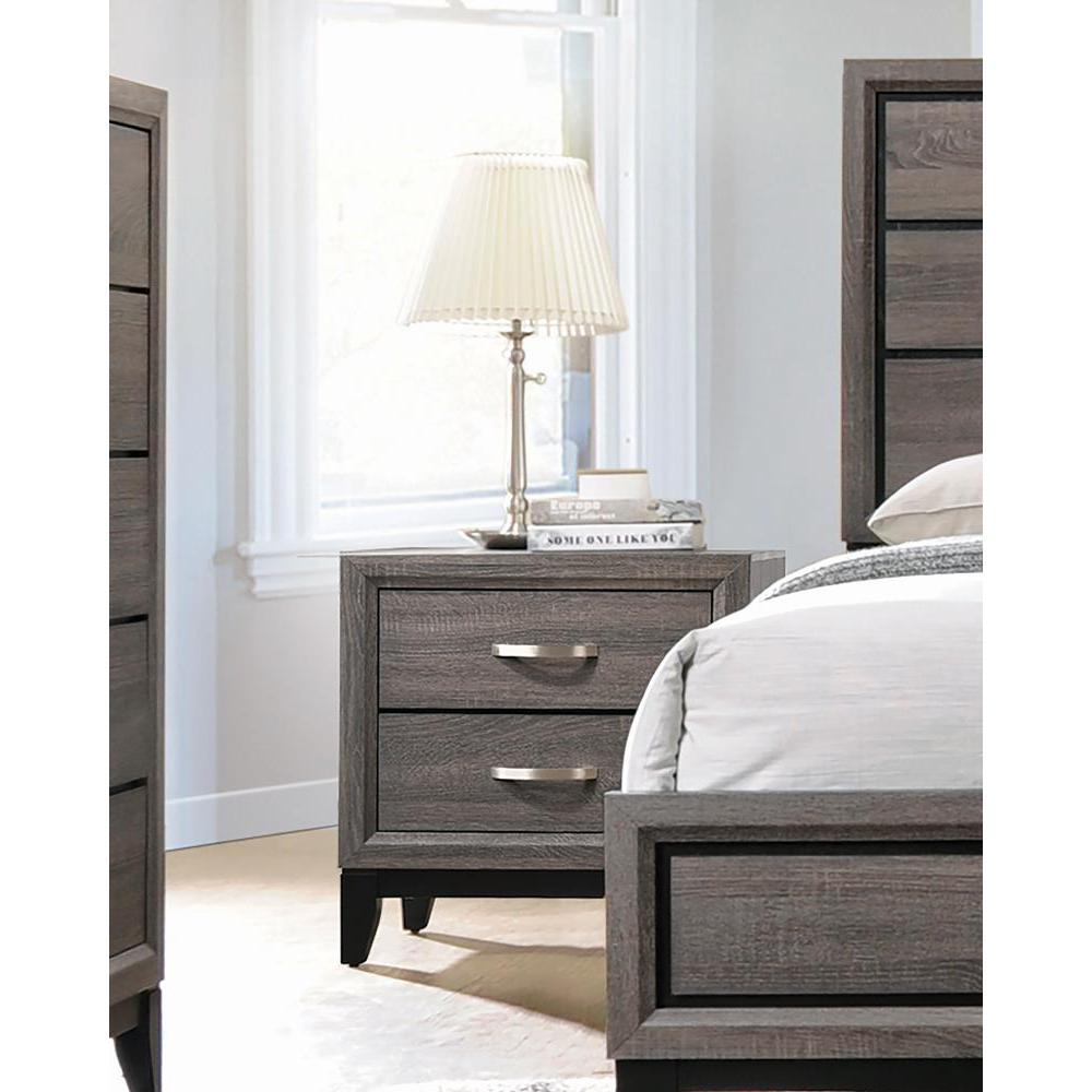 Transitional style bedroom at a great value Nickel finished hardware highlights two-tone grey oak finish Black grooves create a dimensional look Three-dimensional engineered foil paper veneer in grey oak and black English dovetail drawer construction Black finish legs are crafted of solid hardwood