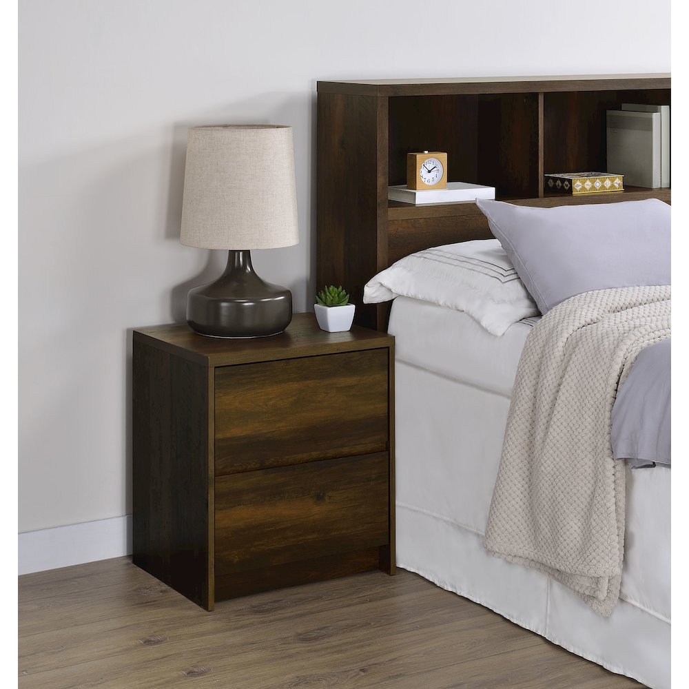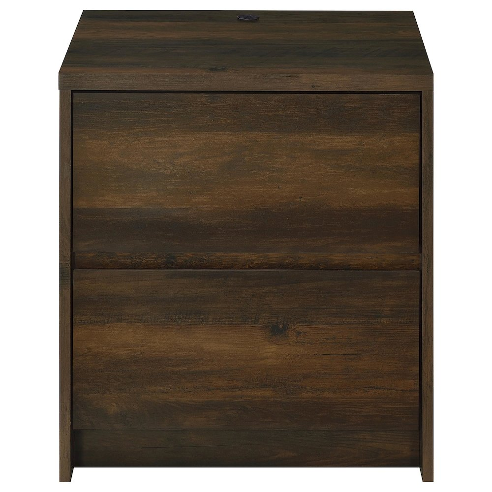 Nightstand with a dark pine-inspired wood grain finish Two spacious drawers for organized storage Integrated dual USB outlet with USB-A and USB-C ports for fast charging Motion sensor LED lighting at the base for nighttime convenience Sturdy engineered wood construction with a scratch-resistant veneer Functional and stylish addition to modern bedrooms