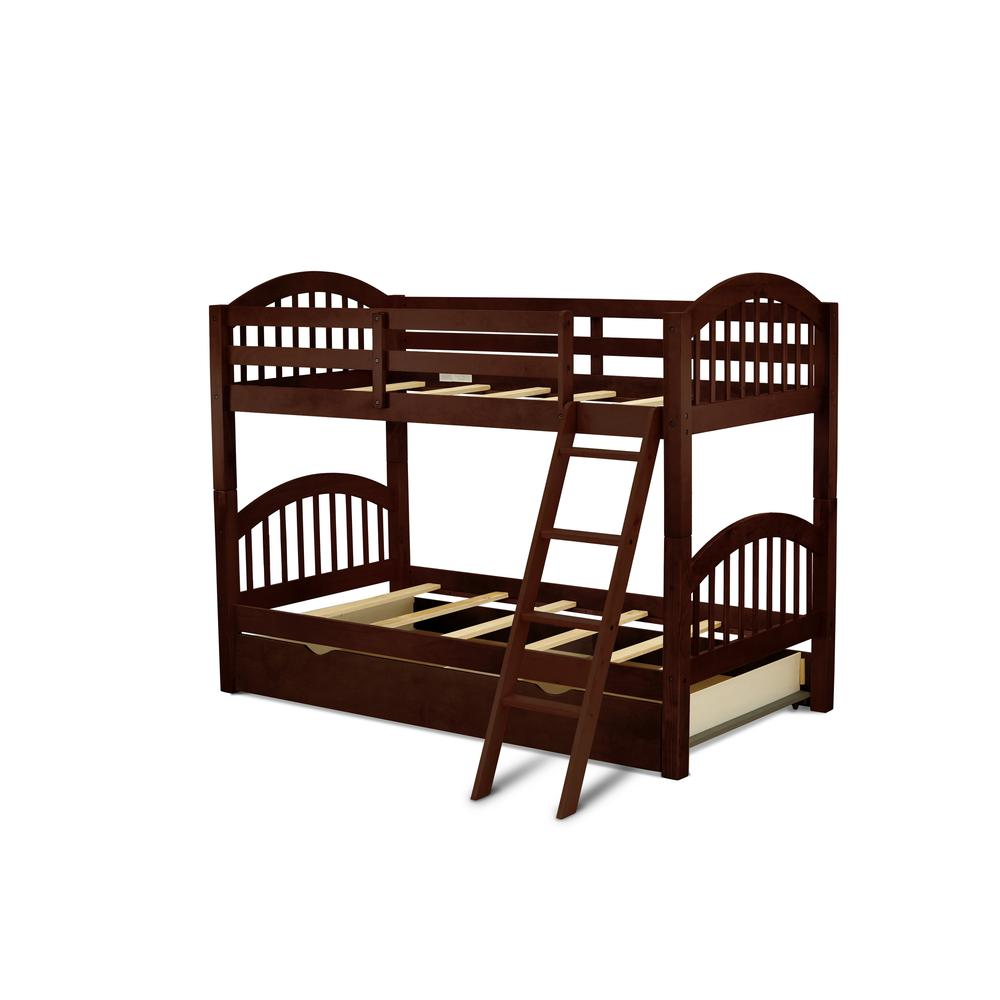 East West Funiture Verona twin over twin bunk bed is the space saving solution for small home with its clean and contemporary design. The bunk bed can be split into two beds as needed. The included full length guard rails and 4-step ladder are crafte Constructed from high quality real wood to ensure the perfect sturdiness of the bed for a good night's sleep. The bed includes full length guard rails and 4-step ladder making it a perfectly safe sleeping option for young children. The bunk bed can fit in different rooms with its clean and timeless design. It can also be separated into two beds as needed. Our bunk bed meets all ASTM and CPSC protection standards. Java color is the modern sophisticated option for your home The bunk bed requires no box spring with the sturdy built-in hardwood slats Our bunk bed comes with a detailed assembling manual. The bed is crafted not to have any wobbling after assembling Our bunk bed requires minimal maintenance. Simply spray it with water and wipe stains out. The bunk bed's measurements are 84 × 42 × 58.