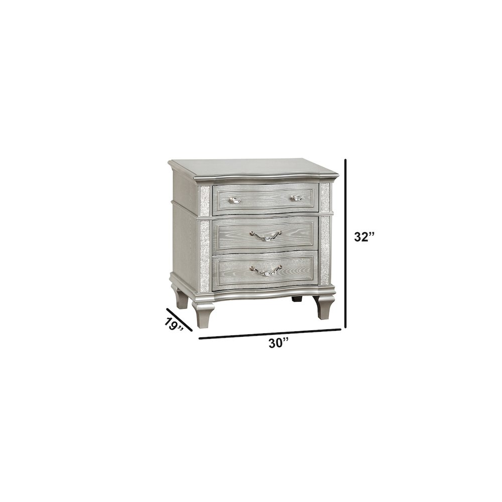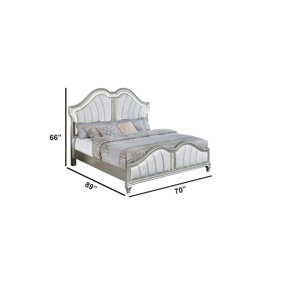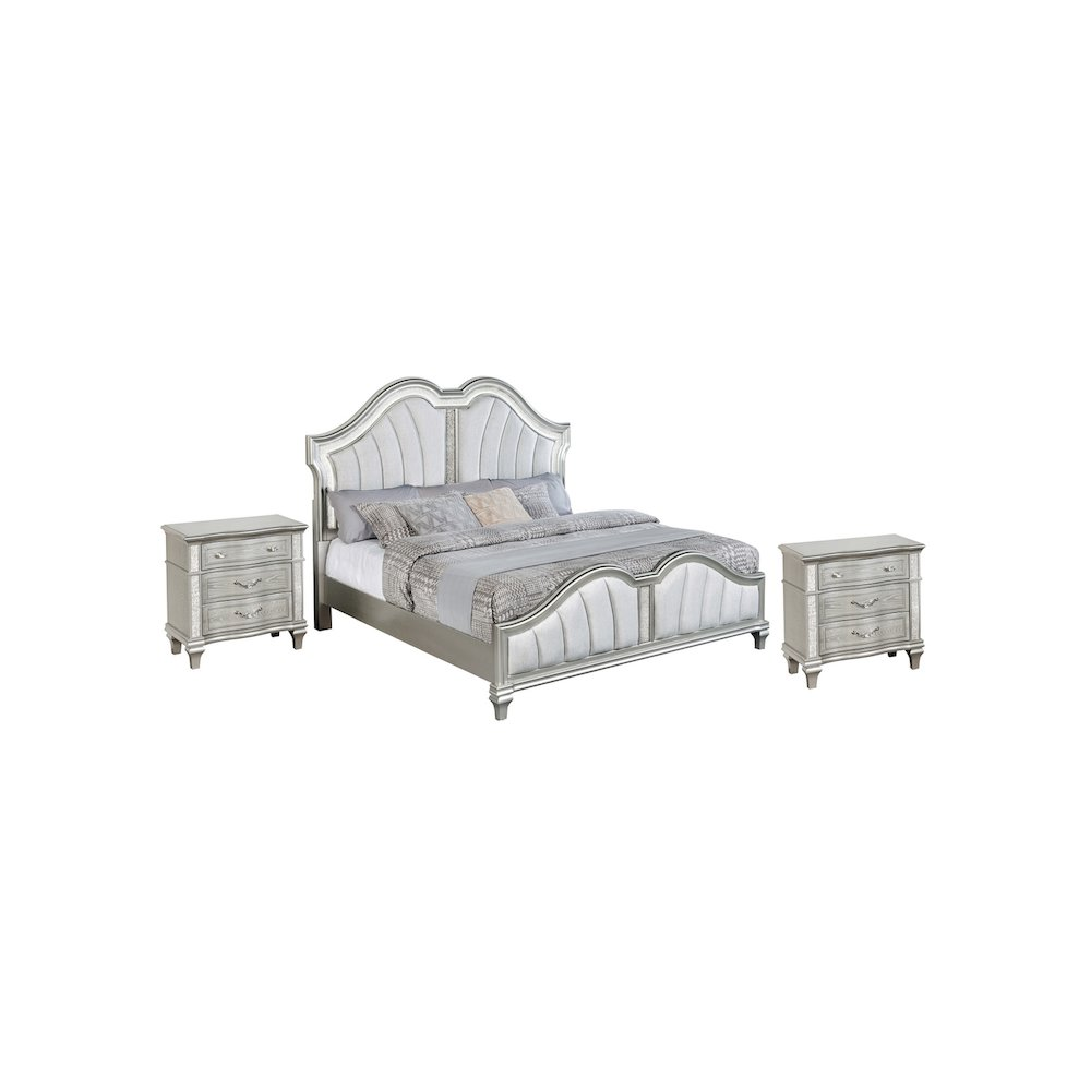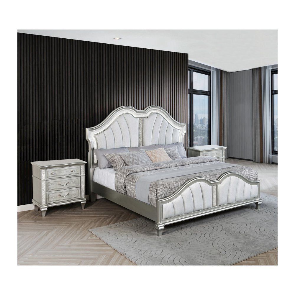 Introducing Best Quality Furniture's stunning new B760 bedroom set, designed to elevate your space with an undeniable touch of luxury and sophistication. This high-end collection is meticulously crafted with a silver-embossed veneer, adding a rich texture and refined aesthetic that exudes glamour. The striking glittered finish not only enhances its beauty but also catches the light, creating an enchanting atmosphere in your bedroom. The centerpiece of this bedroom set is the upholstered headboard, offering both comfort and elegance. Its plush fabric adds a layer of softness and refinement, while the footboard mirrors this high-class design for a balanced, luxurious look. With integrated LED lighting on the headboard, the set offers a modern twist, creating a glowing ambiance that brings warmth and drama to the room. The sparkly glitter panels across the furniture pieces add a dazzling effect, reflecting light and giving the entire set a radiant glow. This bedroom set is not just furniture—it's a statement piece that will transform your bedroom into an extraordinary retreat. Perfect for those seeking both style and functionality, this collection promises to impress with its blend of opulence and modern design.