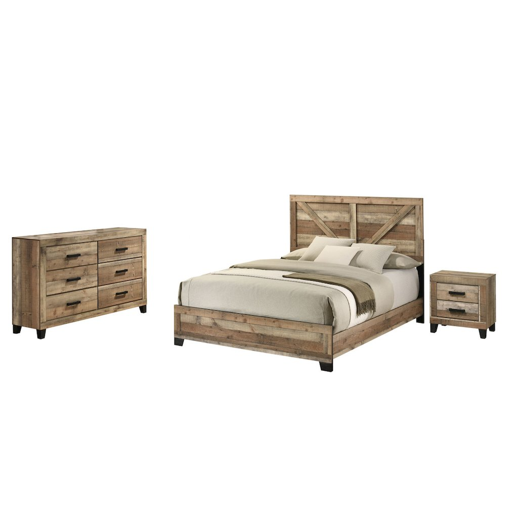 Weathered Brown Pine Eastern King Size Panel Bed MDF wood Bedroom Set: Bed, Dresser, Nightstand