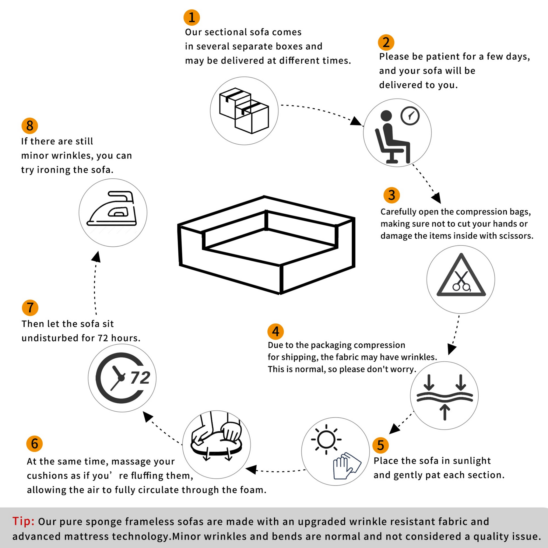 | TIP 2 | Due to package compression for better shipment, the fabric may have wrinkles.Please take all packages out and pat every part to make it rebound better and fluffy, so that itcan restore to picture-like status. |
