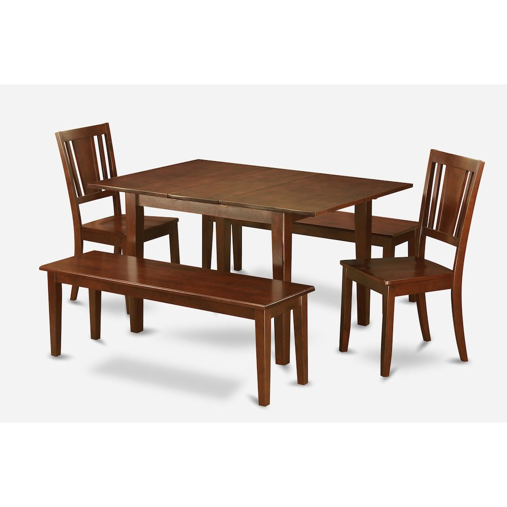 5 Piece Table set with Rectangular Dining room table provides 12 in butterfly leaf , 2 Dudley Wood seat chairs and 2 52 in Long dining benches. Table Dimensions: Length 42 / 54; Width 36; Height 29.5. Chair Dimensions: Length 19; Width 18; Height 36. Bench Dimension: Length 52; Width 16; Height 18. Reliable set for dining room which made of all Asian Hardwood. Basically no MDF, veneer, laminate in our products. Kitchen tables comes with twelve In self storage extension leaf That Can Be Stored Right Below Table Top