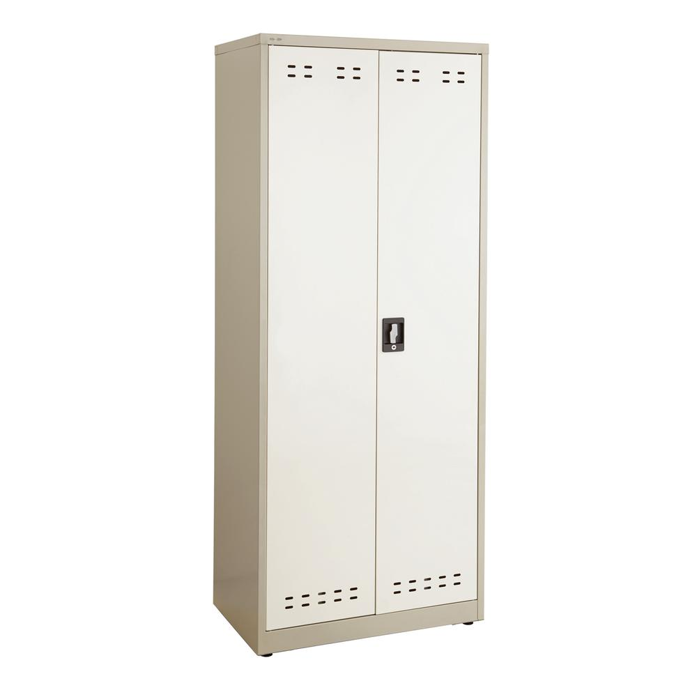 Metal storage cabinet 72" high cabinet with four adjustable shelves All shelves adjust in 1" increments and rated up to 250 lbs. Heavy-gauge steel uni-body construction Two-tone, Gray powder coat finish for durability Recessed locking door handle with three-point locking design and adjustable leveling glides Complements design of Safco lockers