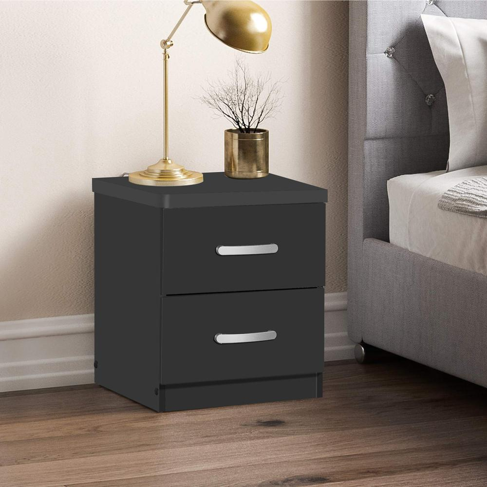 Contemporary style nightstand crafted from laminated engineered wood in Black color finish. Two standard drawers offering plenty of storage space to help keep your room organized. Each drawer has euro-glide metal tracks with safety stop and support for a sturdy long lasting nightstand. Silver color plastic bar handles will match any decor in your bedroom or guest room. Overall Dimension: 16"D x 17"W x 20"H. Slim bedside table, easy to fit into small space. Assembly required by adult. Hardware and assembly instructions included in package. Product Dimensions: 16"D x 17"W x 20"H Number of Drawers: 2 Assembly Required: Yes