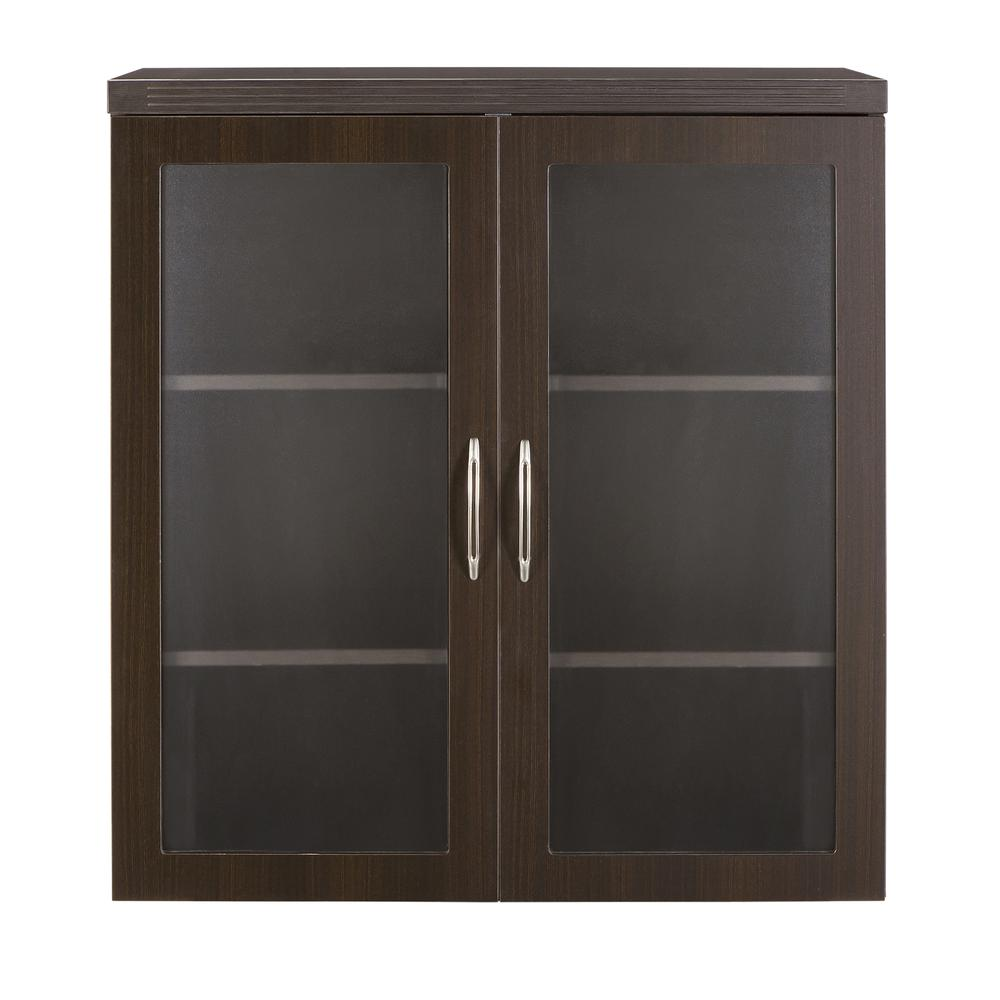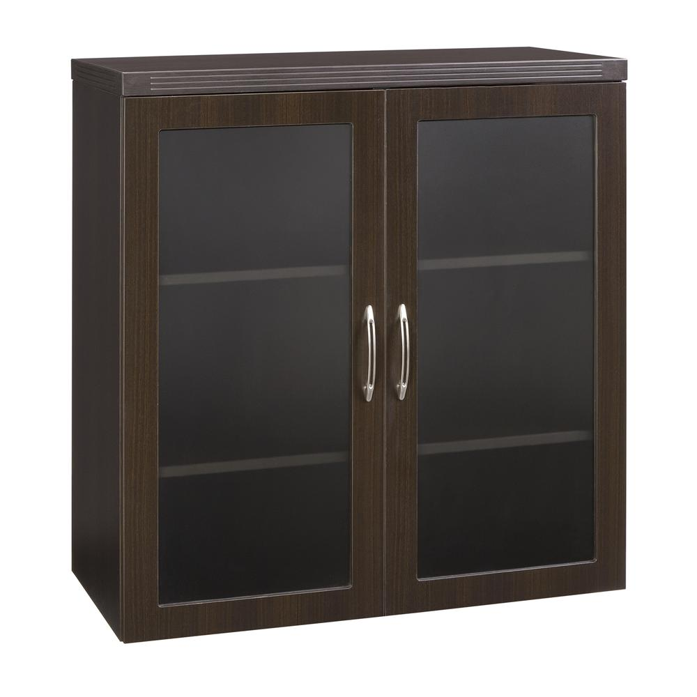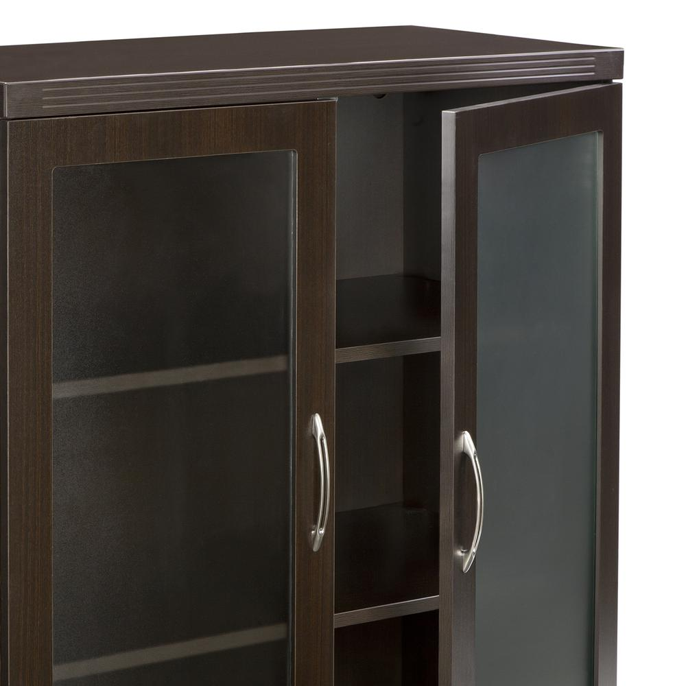 Textured glass highlight cabinet contents and still provide privacy. Glass is tempered for safety and durability. Two (2) adjustable shelves on 1 1/4" increments wi Curved metal pulls with brushed nickel finish. Additional pull options available. Grommet in back panel for wall access. Mouse hole in shelf to permit vertical routing of cables.