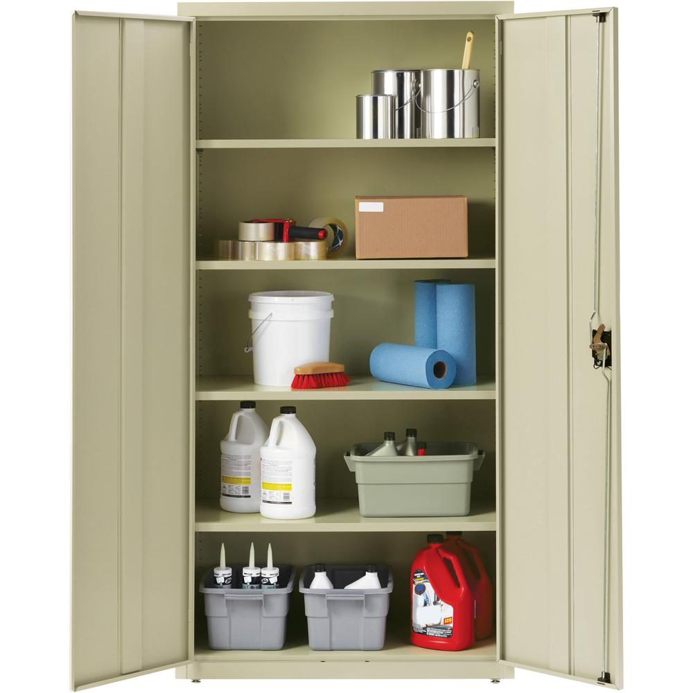 Storage cabinet offers a sturdy, private storage space for your office. Secure your belongings using the contemporary, three-point, recessed locking handle with keys. Durable cabinet is made of welded steel and holds 180 lb. per shelf, evenly distributed. Four shelves are fully adjustable in 2" increments. The bottom shelf is fixed. Welded steel construction has a powder-coat finish to make it last longer. 72" high cabinet also features three sets of hinges per door and meets or exceeds ANSI/BIFMA standards.