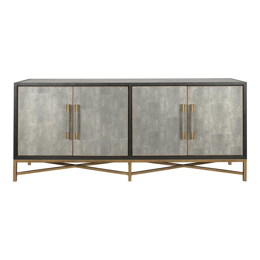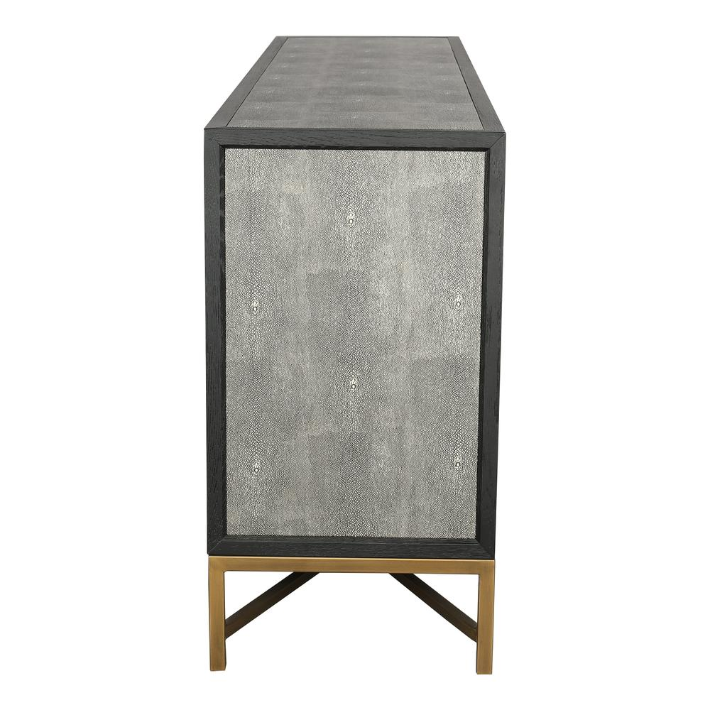 A contemporary homage to the timeless allure of Art Deco, the Mako sideboard infuses understated sophistication with rich visual texture and enduring style. This striking storage solution is artfully crafted with a grey oak frame, upholstered with luxurious vegan leather and adorned with antique gold-finished accents for a harmonious blend of subtlety and depth.