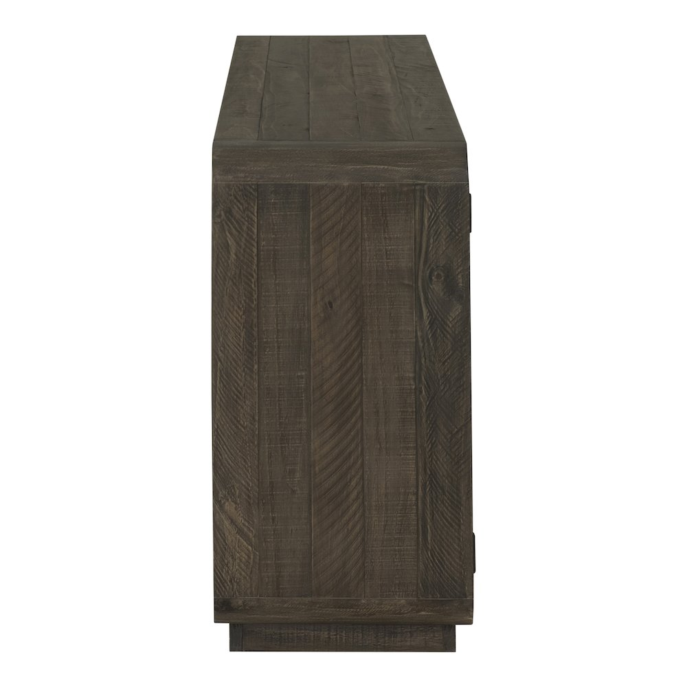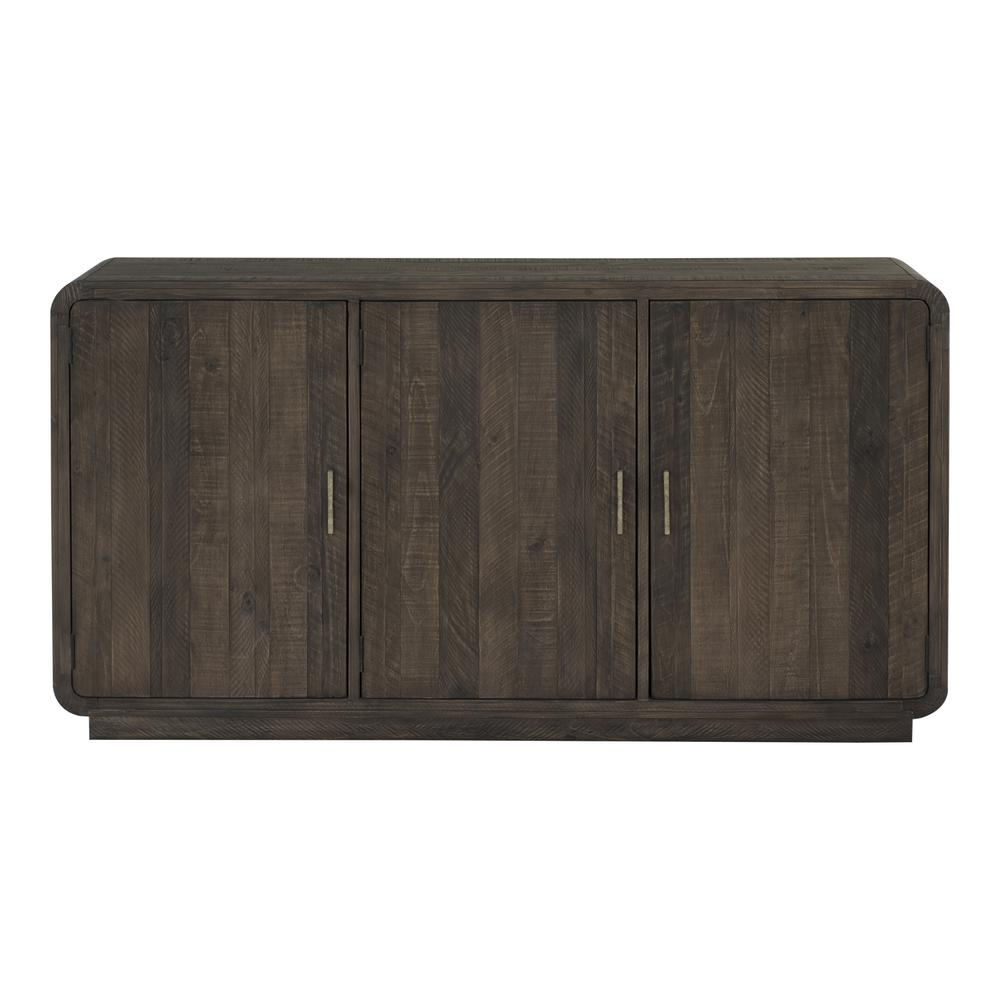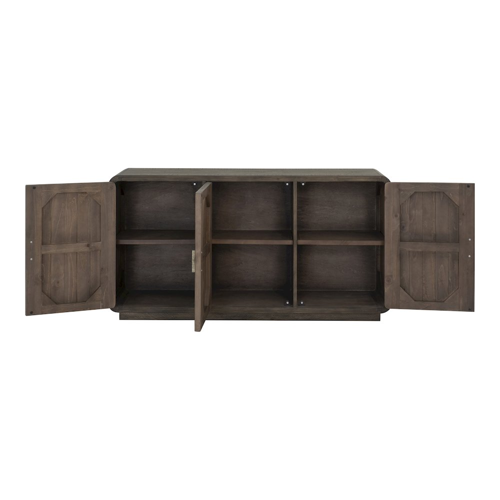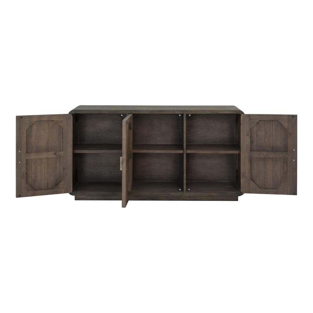 Solid pinewood with a matte, driftwood finish 3 cabinet doors with magnetic closures Ample interior storage with 6 compartments + adjustable shelves Fully finished back