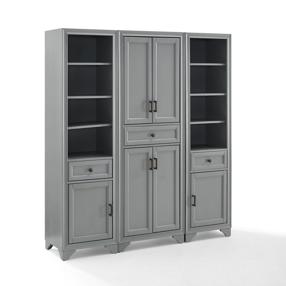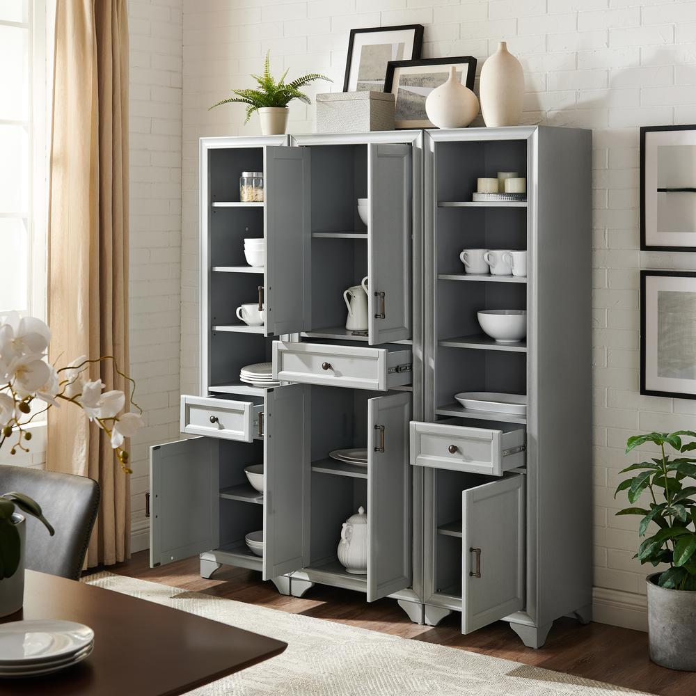 FARMHOUSE FLAIR: With a hand-rubbed, distressed gray finish, this storage pantry set adds modern farmhouse style to any space. The metal hardware has a distressed brass finish, enhancing the vintage charm and complementing traditional decor styles. SPACIOUS STORAGE: This set includes a pantry with 2 double-door cabinets and 2 tall single-door cabinets, all with magnetic closures and adjustable shelves. Each tall cabinet has 3 open adjustable shelves for display, each supporting up to 15 lbs. CONVENIENT DRAWER SPACE: There are three large, full-extension kitchen drawers on smooth ball-bearing glides, each with 15-lb weight limits. MODULAR ORGANIZATION: This set is modular and the doors of the two tall cabinets can be installed on the left or right, creating the look of built-ins. It includes a pantry (23.75"W x 15"D x 67.75"H) and two tall cabinets (18"W x 15"D x 67.75"H). AMERICAN LEGACY: Inspired by over 100 years of the Crosley legacy, Crosley Furniture offers style for every space, from retro to modern. Crosley products are proudly designed in the USA and come with USA-based customer support. Distressed gray finish Genuine metal hardware in a distressed brass finish One adjustable shelf in each cabinet of the pantry One large storage drawer on full-extension ball-bearing glides in the pantry Three adjustable open shelves in each tall cabinet Each tall cabinet features a lower cabinet with an adjustable shelf inside Each tall cabinet features a full-extension storage drawer on ball-bearing glides Cabinet door on the tall cabinet can be installed to open from the left or right