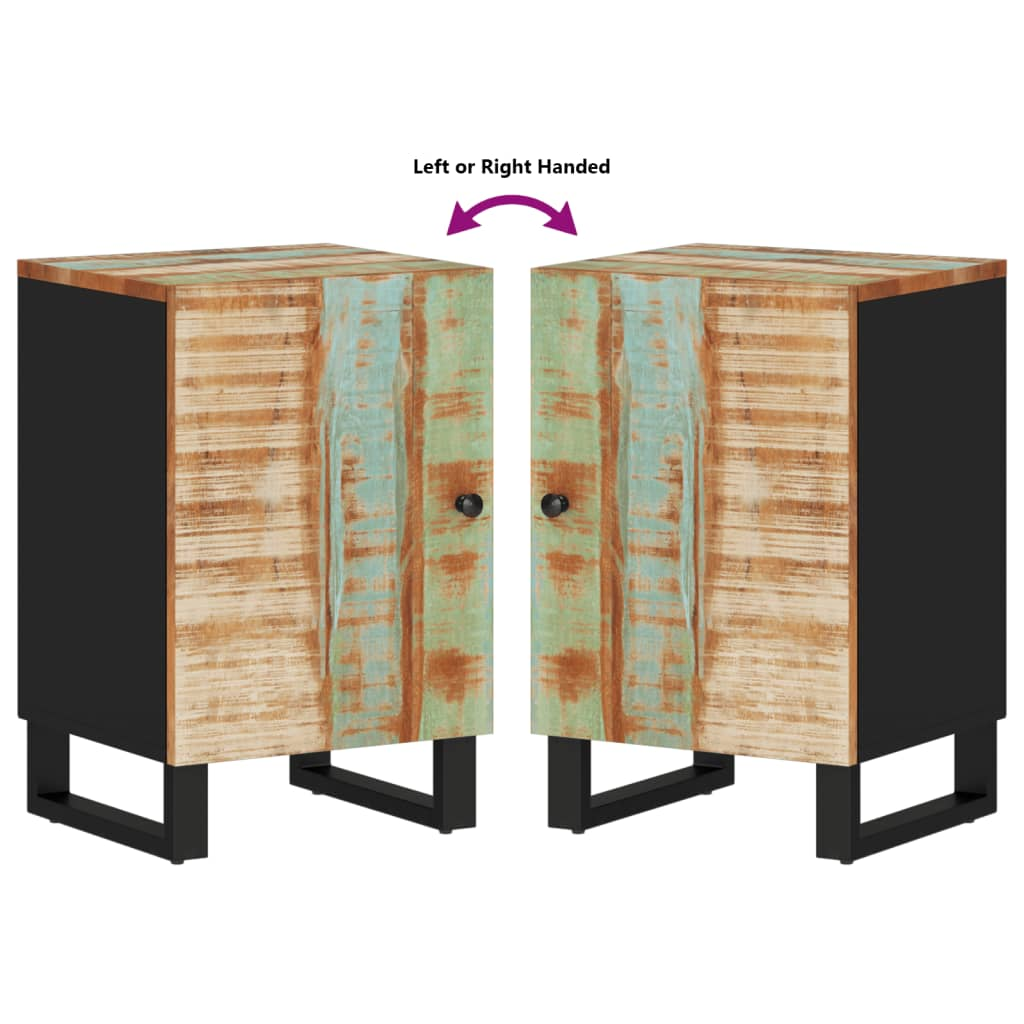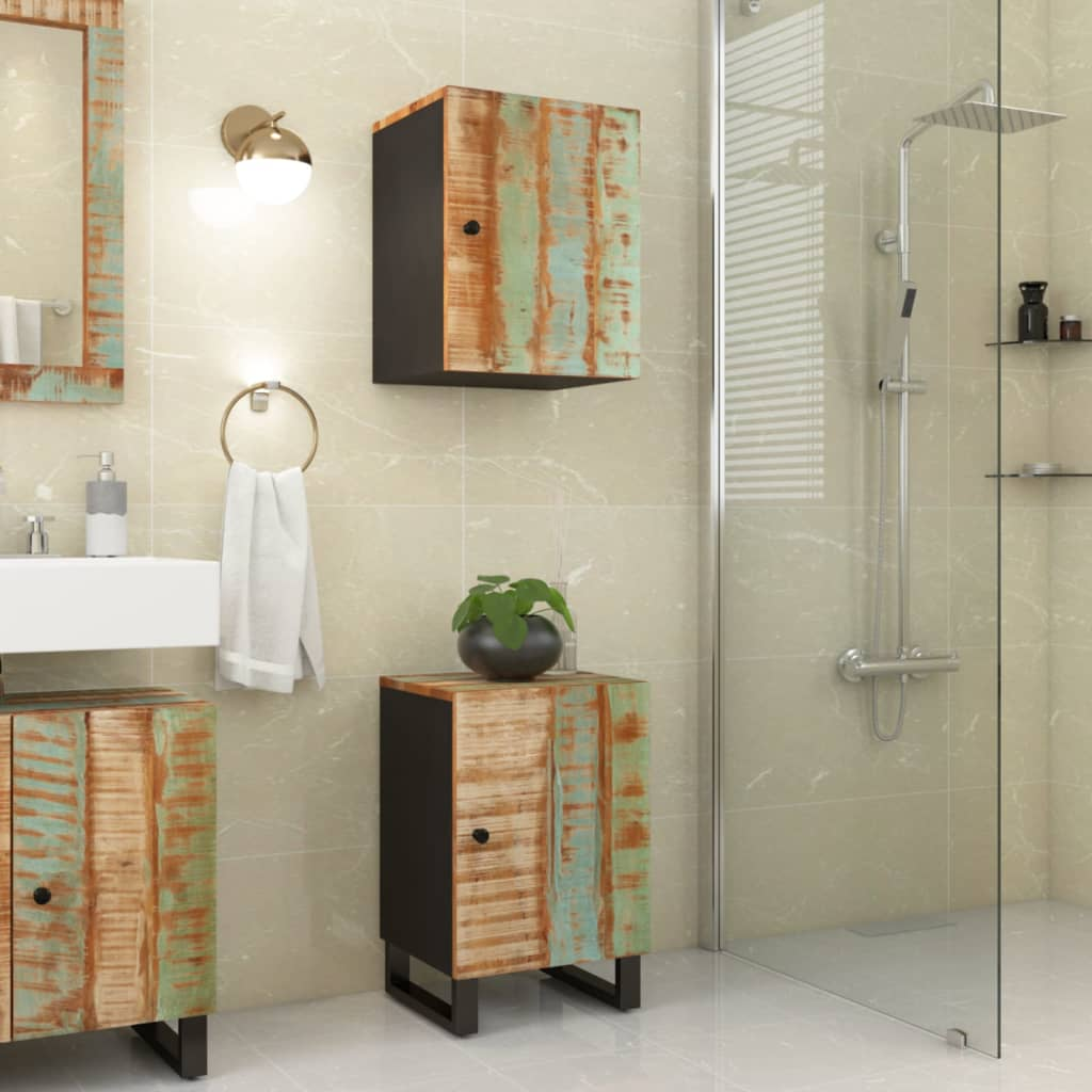 This rustic bathroom cabinet combines a unique multicolor design with functional storage, giving your bathroom a makeover. Made from solid reclaimed wood and engineered wood, it's got a sturdy iron frame, capturing earthy charm while holding all your towels and toiletries.