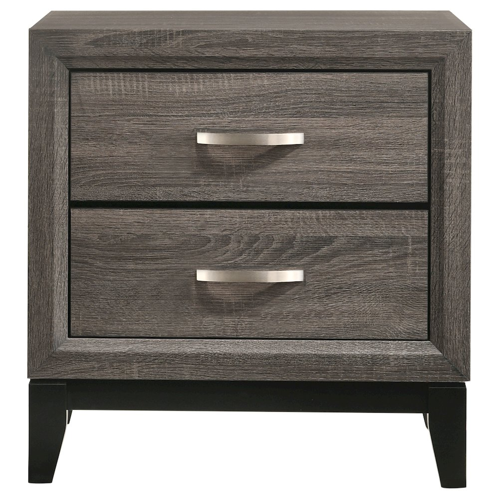 Transitional style bedroom at a great value Nickel finished hardware highlights two-tone grey oak finish Black grooves create a dimensional look Three-dimensional engineered foil paper veneer in grey oak and black English dovetail drawer construction Black finish legs are crafted of solid hardwood