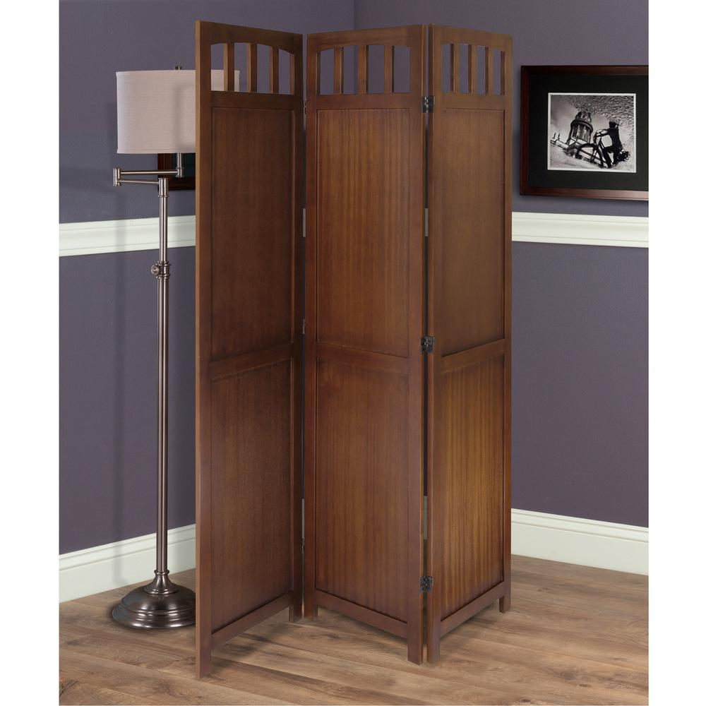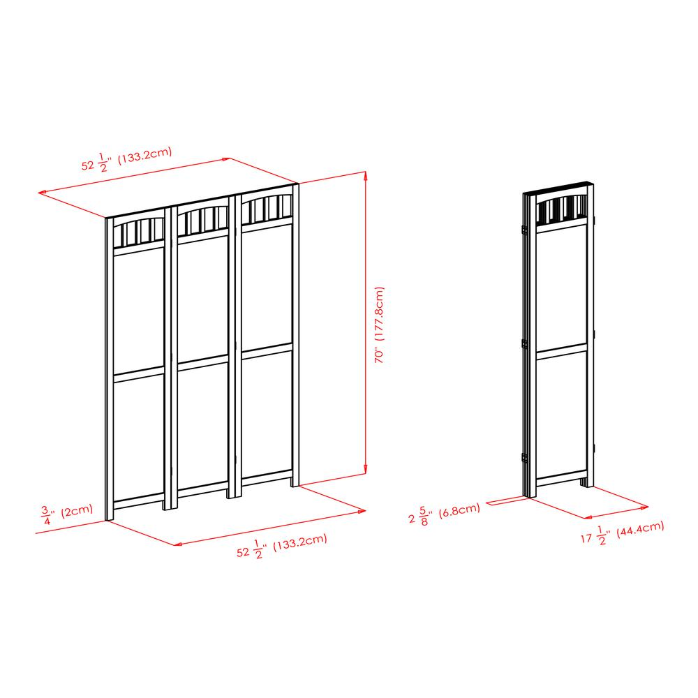Screen has three panels with size of 52.40"W x 0.80"D x 70"H. Easy to move when folded. Folded is 17.4"W x 2.3"D x 70"H. Each screen panel is 17.48"W. Made of solid wood frame and plywood panels in Walnut finish.
