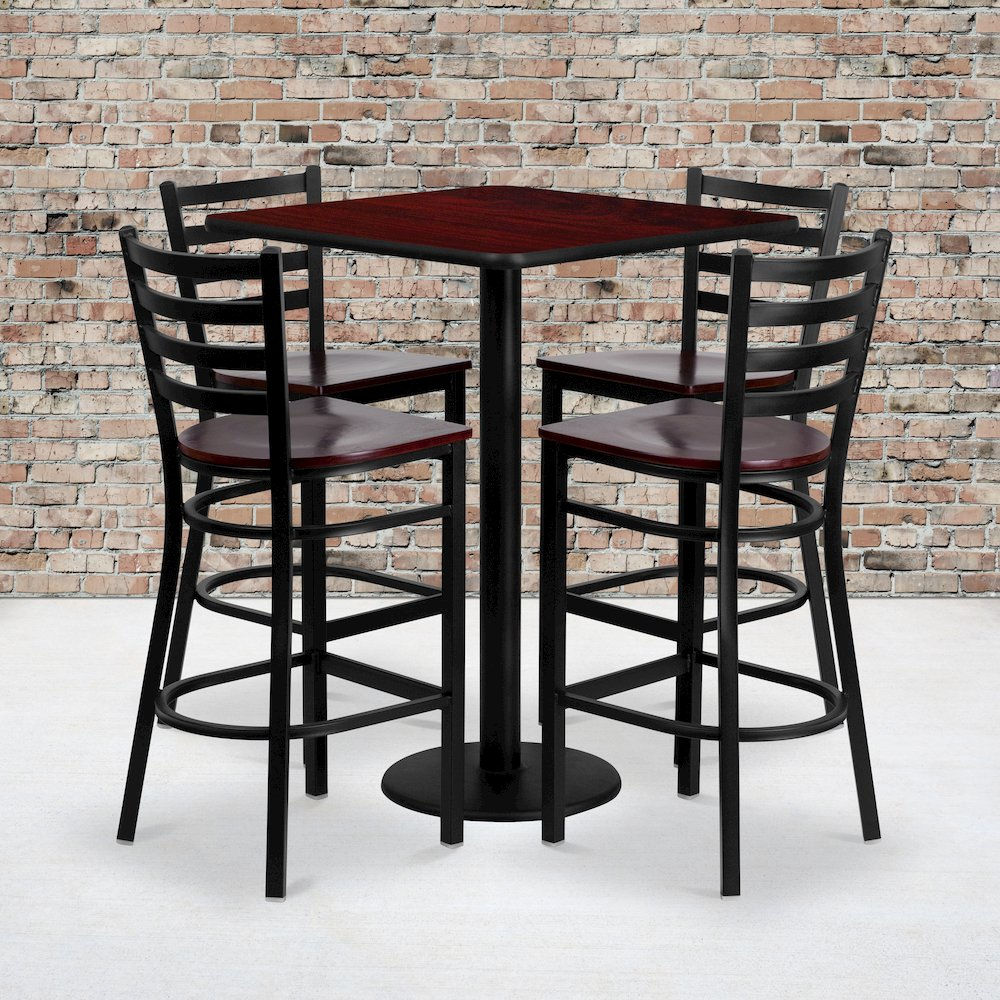 Bar Height Table and Stool Set Set Includes 4 Barstools, Square Table Top and Round Base Designed for Commercial and Home Use Square Table 1.125" Thick Square Top Mahogany Laminate Finish High Impact Melamine Core Black T-Mold Protective Edging 18" Round Restaurant Table Base with 3" Diameter Bar Height Column Cast Iron Construction
