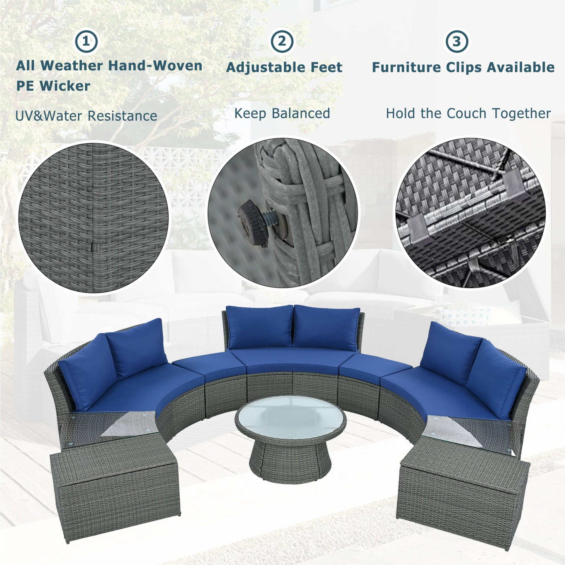 10-Piece Outdoor Sectional Half Round Patio Rattan Sofa Set, PE Wicker Conversation Furniture Set for Free Combination, Blue