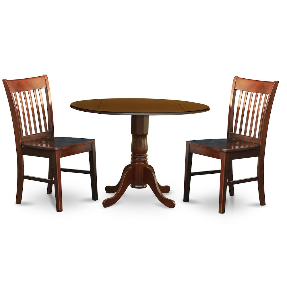 Premium Rubberwood Construction: This 3-piece dining set is crafted from high-quality Asian rubberwood, ensuring exceptional durability and longevity, with a smooth and refined finish. Elegant Mahogany Finish: The table features an unblemished mahogany tabletop and finish, complemented by the mahogany-finished wooden legs and comfortable wooden seats of the two chairs, adding a touch of sophisticated elegance. Compact and Space-Saving: With a round 42-inch diameter tabletop and a drop leaf design, this set is perfect for small spaces or casual dining areas, seating up to 2 people comfortably.