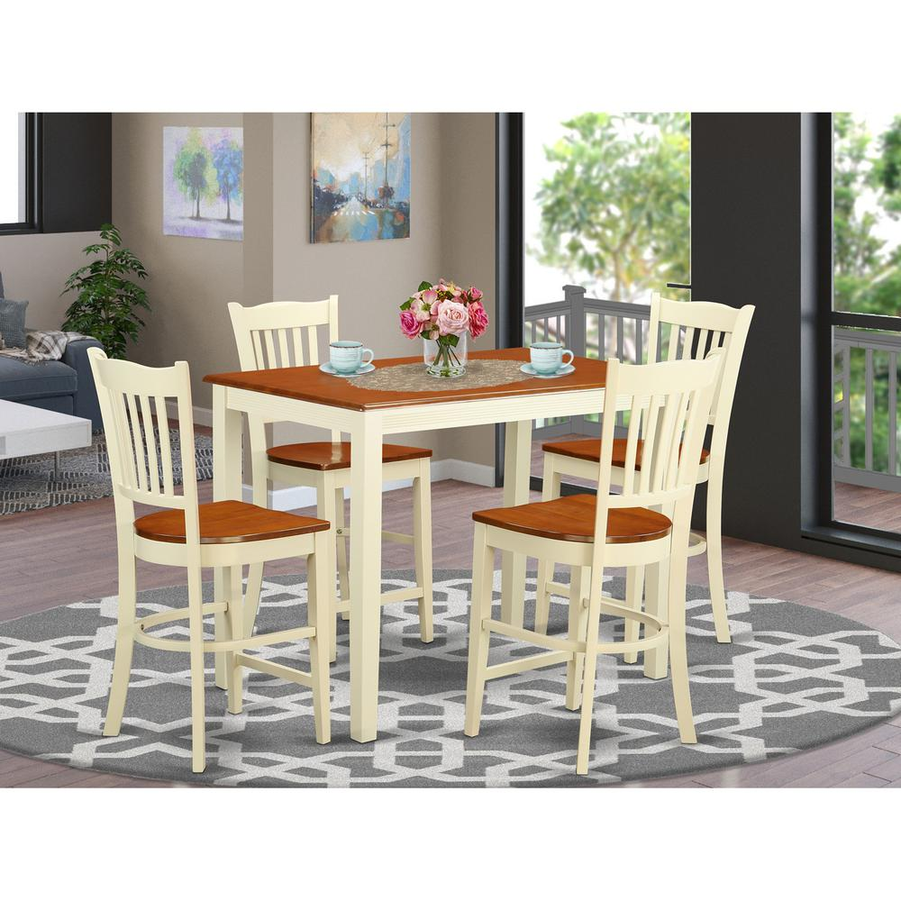 5 Piece Moderate rectangular counter height table along with 4 solid wood stools finish in a warm Buttermilk & Cherrycolor with wood seat. Table Dimensions: Length 48; Width 30; Height 36. Chair Dimensions: Length 17; Width 18; Height 42. Prime quality dining room set that created with 100% Asian Hardwood. No MDF, veneer, laminate made use of in our products.