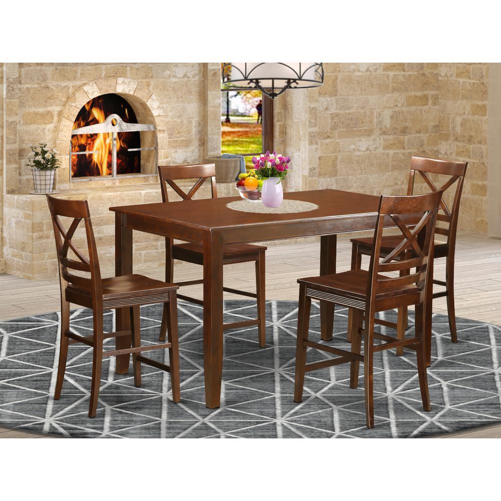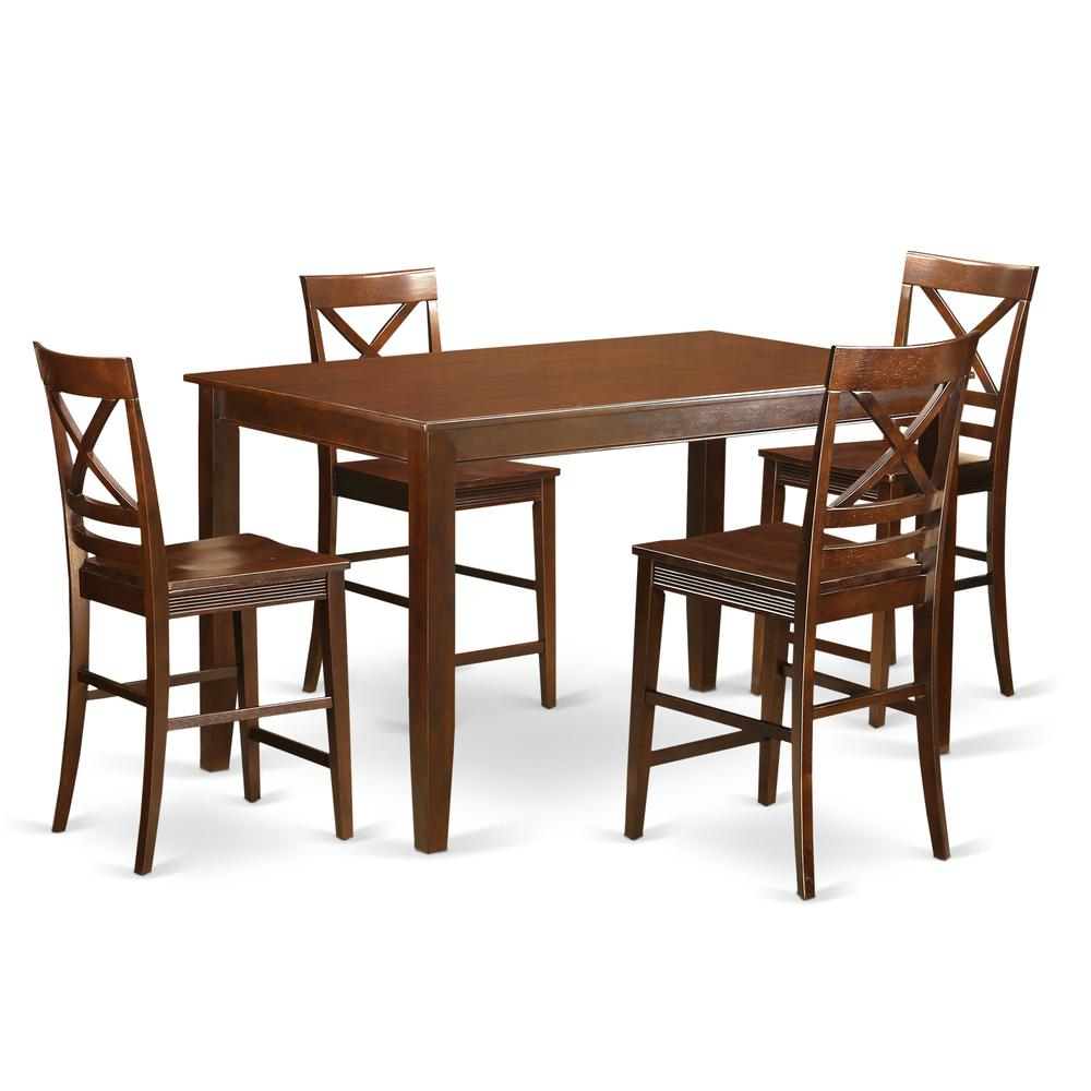 5 Piece Classy rectangular counter height table together with four dining room chairs finish in a warm mahogany color with wood seat. Table Dimensions: Length 60; Width 36; Height 36. Chair Dimensions: Length 18; Width 17.5; Height 42. Great quality set for dining room that created 100% Asian Hardwood. An absense of MDF, veneer, laminate in our products.