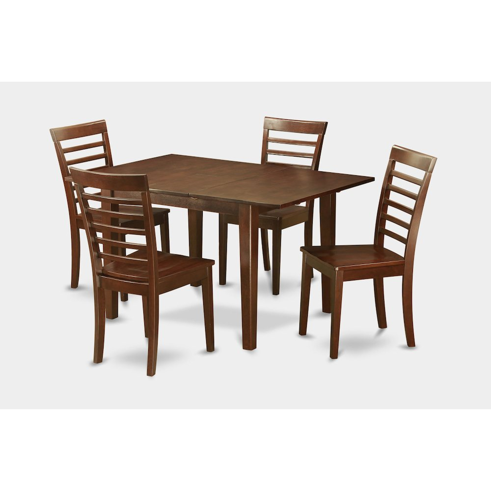 5 Piece Dinette set with Rectangular Dining table features 12 in butterfly leaf and 4 Wood seat chairs. Table Dimensions: Length 42 / 54; Width 36; Height 29.5. Chair Dimensions: Length 17; Width 16.5; Height 37. Top notch kitchen set which crafted from all Asian Hardwood. Absolutely no MDF, veneer, laminate applied to our items. Kitchen tables offers you 12In self storage extendable leaf That Can Be Stored Right Under Table Top