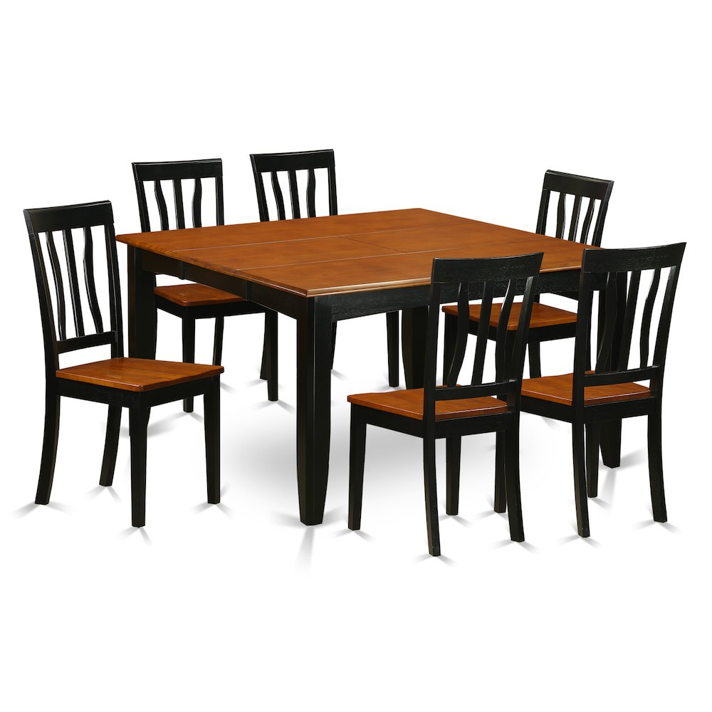 This 7 piece dining set Includes dining table and 6 wood seat dining room chairs finished in Black and Cherry. Table Dimensions: Length 36 / 54; Width 54; Height 30. Chair Dimensions: Length 18; Width 18; Height 38. This dinette table is manufactured out of All Asian Solid wood from top to bottom. No MDF, or softwood venner used. This amazing Square table includes 18In self storage extension leaf That Is Stored Right Beneath Table Top