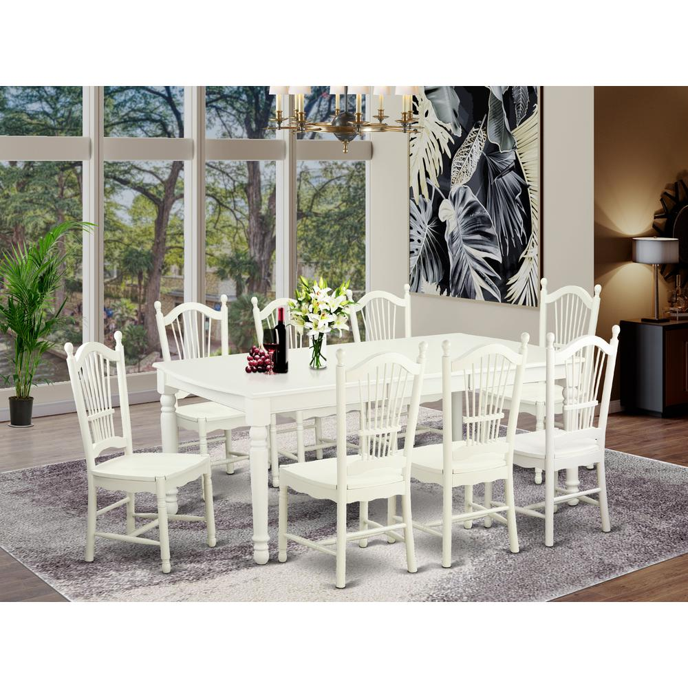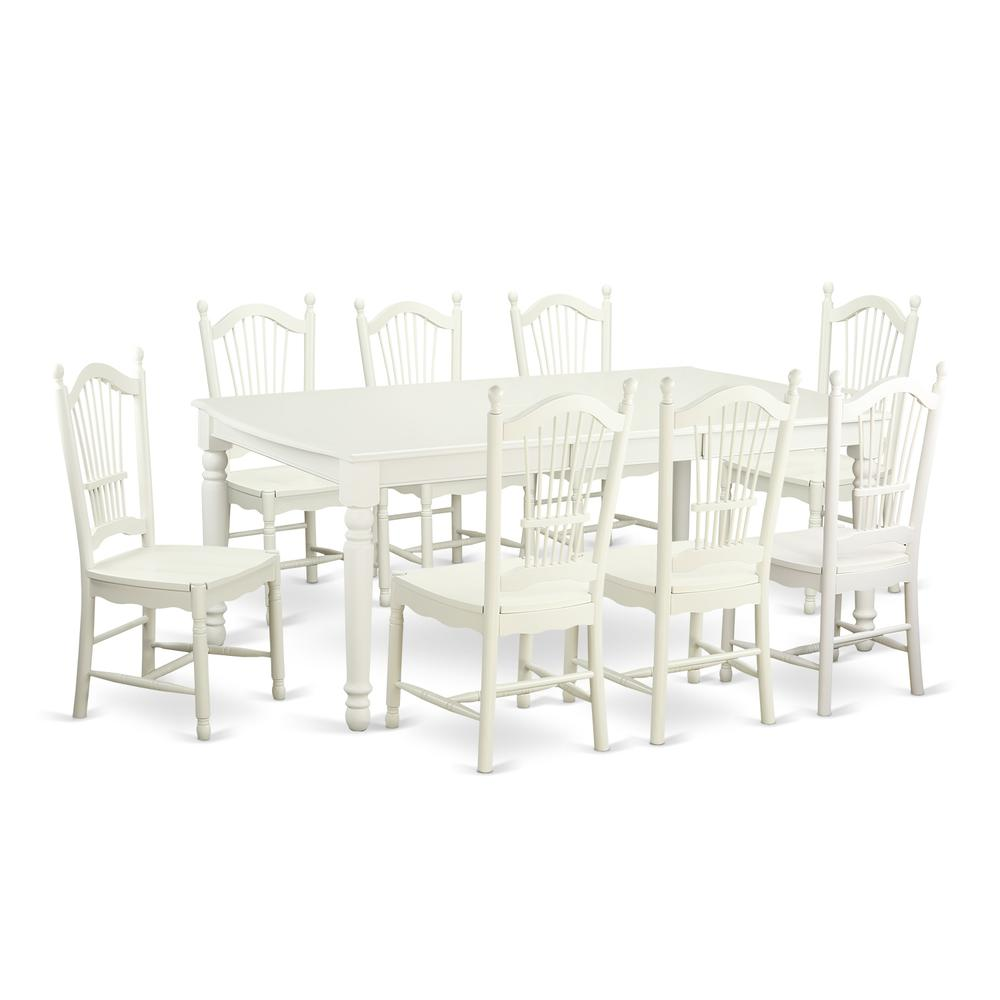 This 9 piece dinette kitchen table set includes one dinette rectangular table with a butterfly leaf and 8 Microfiber seat matching dinette chairs in a luxurious Linen White finish. Table Dimensions: Length 60/78; Width 42; Height 30. Chair Dimensions: Length 17.5; Width 18.5; Height 39.5. The best quality dining room set which made all Asian Hardwood. Simply no MDF, veneer, laminate moved to our products. The Table offers you integrated 18 In self storage extension leaf which can be stored right beneath table the top