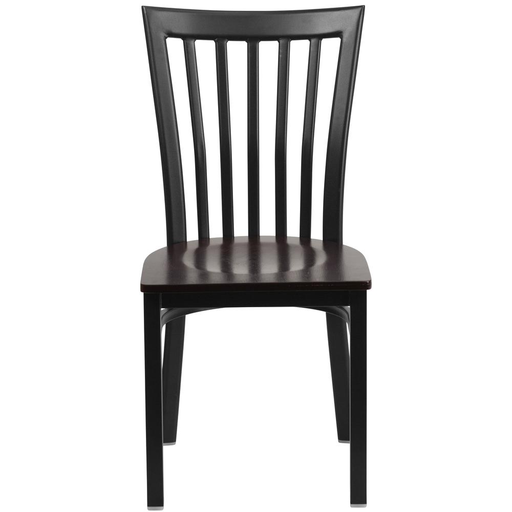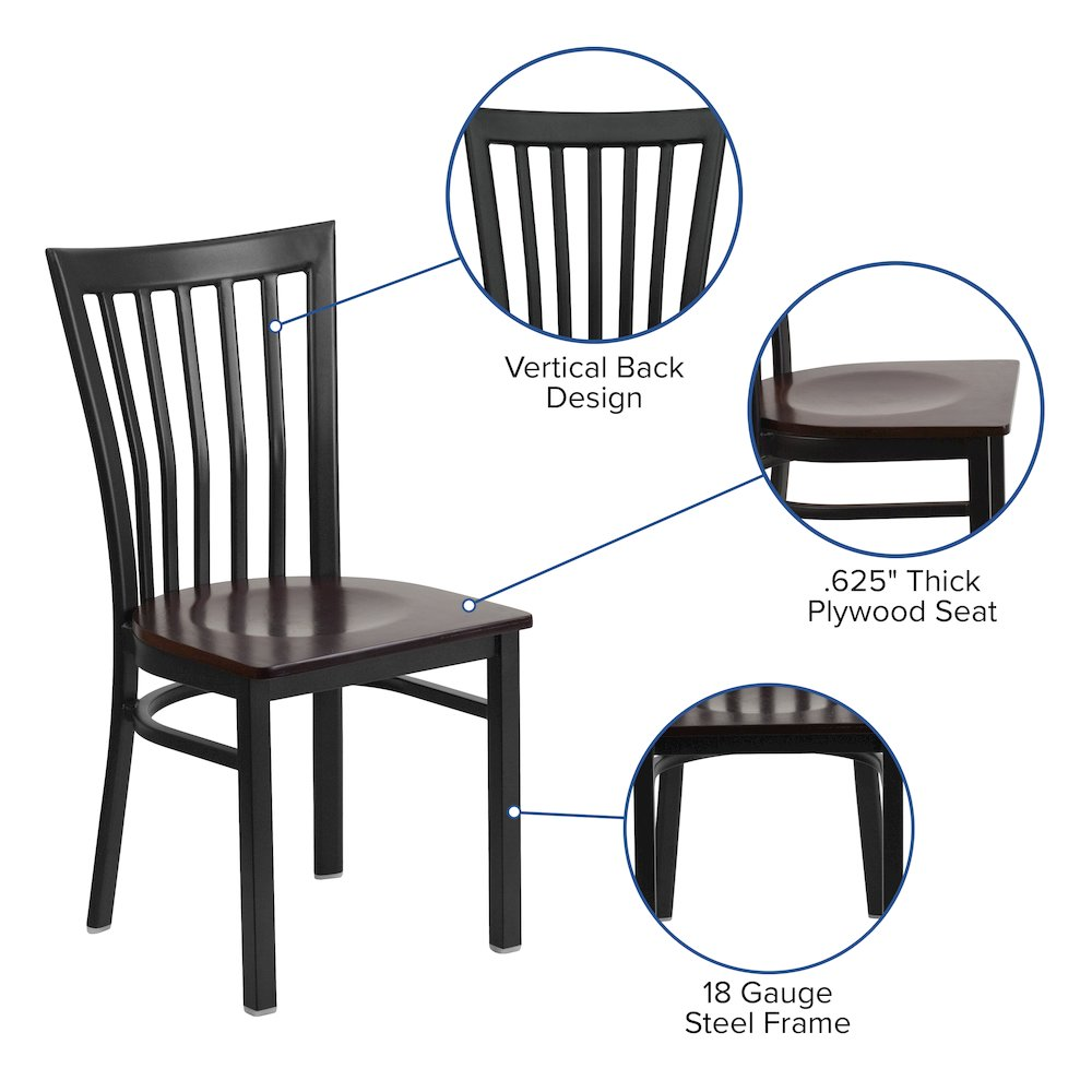 Metal Dining Chair 500 lb. Weight Capacity School House Back Design Walnut Finished Wood Seat .625" Thick Plywood Seat Welded Joint Assembly, Curved Support Bar 18 Gauge Steel Frame Black Powder Coated Frame Finish Floor Protector Plastic Glides Designed for Commercial Use; Suitable for Home Use