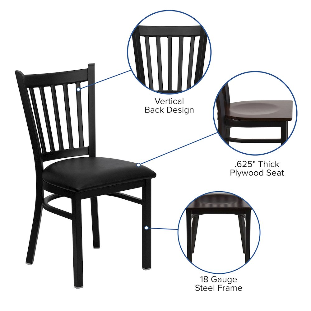 Metal Dining Chair 500 lb. Weight Capacity Vertical Back Design Walnut Finished Wood Seat .625" Thick Plywood Seat Curved Support Bar 18 Gauge Steel Frame Black Powder Coated Frame Finish Floor Protector Plastic Glides Designed for Commercial Use; Suitable for Home Use