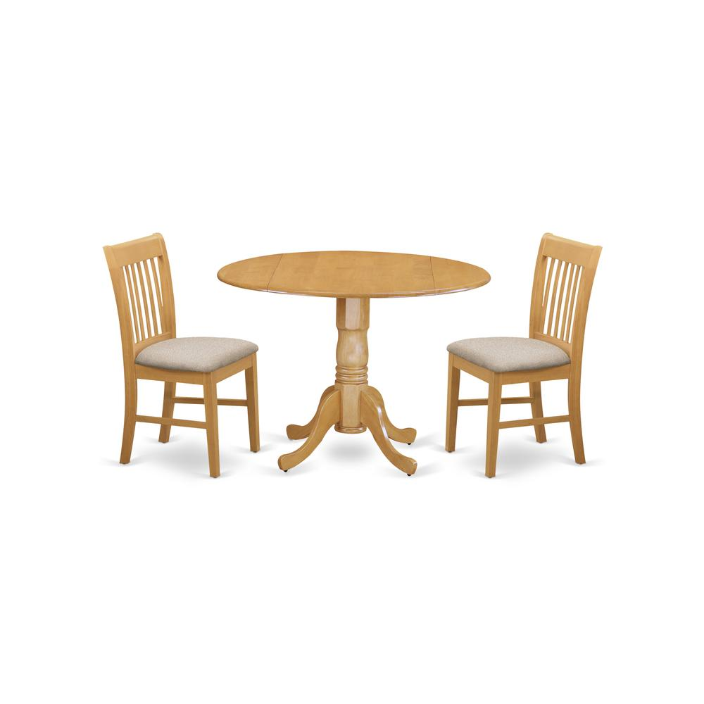 3 piece Dublin Round Table with two 9 in drop Leaves and 2 microfiber upholstered seat Norfolk chairs in a warm Oak finish. Table Dimensions: Length 42; Width 42; Height 29. Chair Dimensions: Length 18; Width 17; Height 36. Premium set for dining room which derived from all Asian Hardwood. Absolutely no MDF, veneer, laminate made use of in our products. Round table features two 9-Inch Drop Leaves. Beneficial To small kitchen