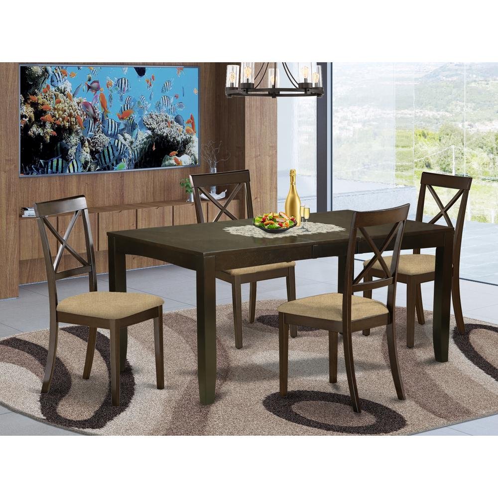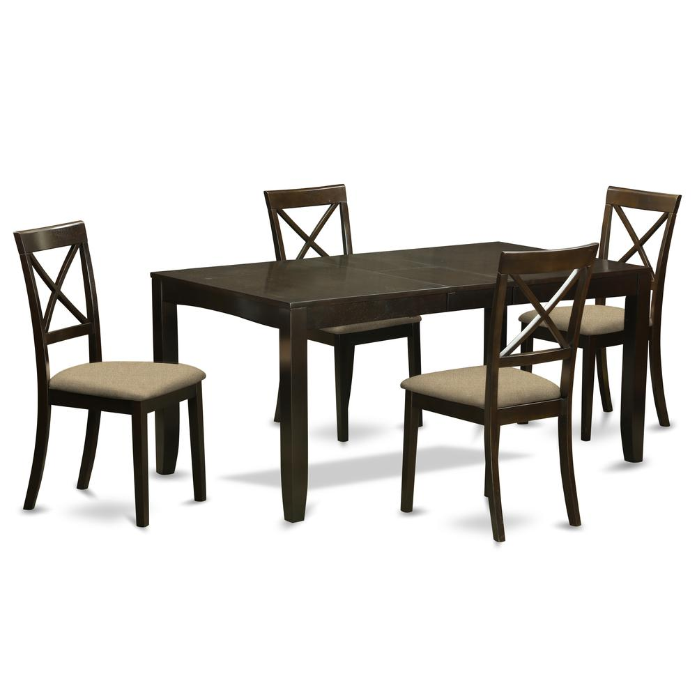 This 5 piece dining set Includes rectangular dining table & 4 upholstered seat dining room chairs and one bench finished in Cappuccino. Table Dimensions: Length 54/66; Width 36; Height 30. Chair Dimensions: Length 17.5; Width 17; Height 38.5. Premium quality dining set which constructed with all Asian Hardwood. Absolutely not MDF, veneer, laminate used in our items. Dining table gives you twelve In self storing extension leaf Which Can Be Stored Right Under Table Top