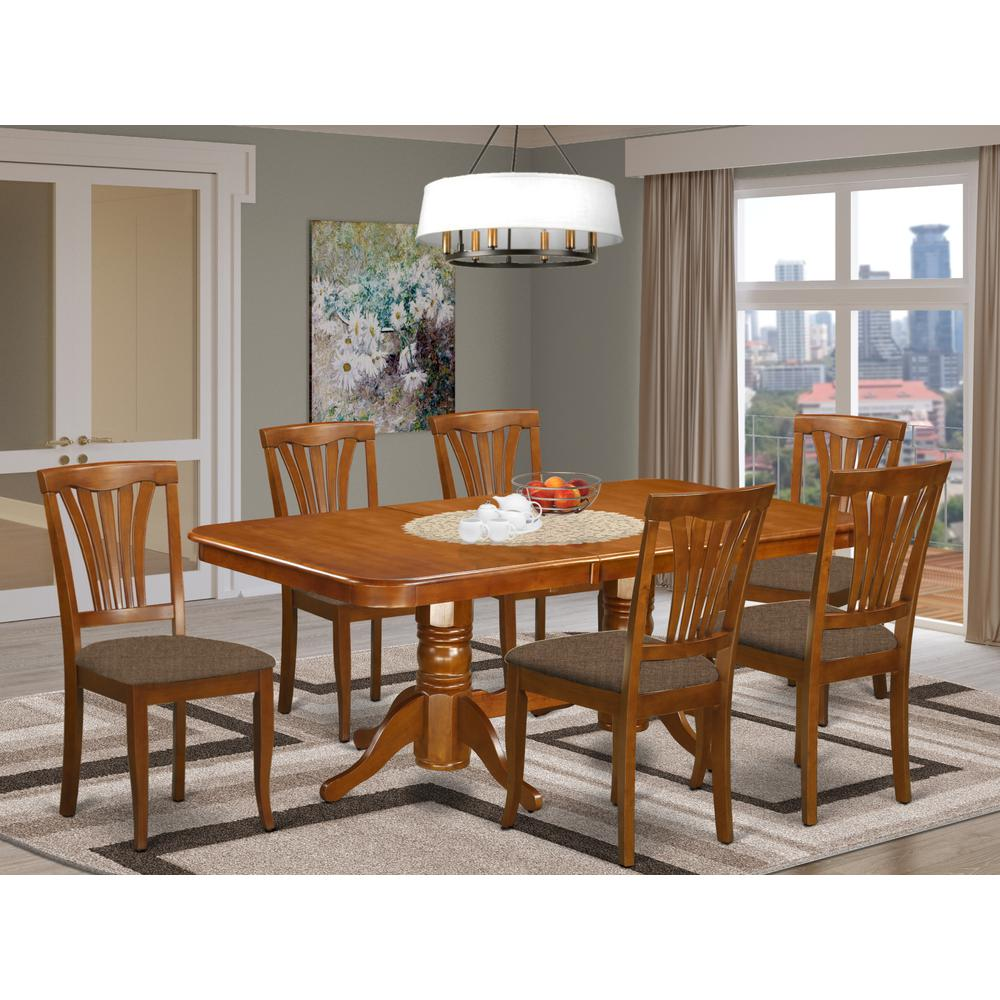 7 piece Napoleon Double Pedestal Table and 6 Avon Cushioned Chairs. Table Dimensions: Length 60 / 78; Width 40; Height 30. Chair Dimensions: Length 18; Width 18; Height 37. Premium dining room set that made of all Asian Hardwood. Completely no MDF, veneer, laminate used our goods. Dining room table offers integrated 18 In self storage butterfly Leaf That's Stored Right Under Table Top