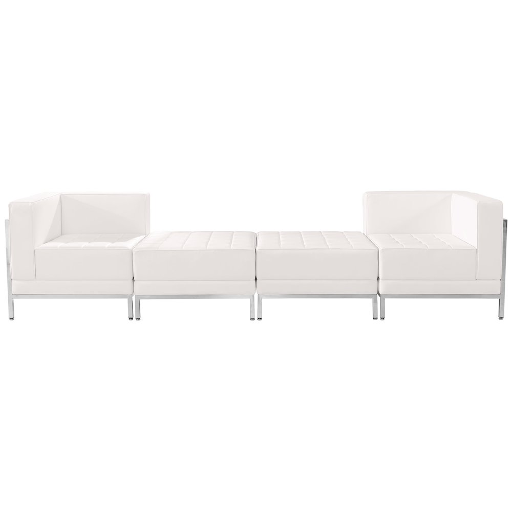 Contemporary Reception Set Black LeatherSoft Upholstery Track Arms Smooth Fixed Back and Tufted Fixed Seat Foam Filled Cushions with CAL 117 Fire Retardant Foam Exposed Accent Bar and Integrated Stainless Steel Frame Middle Chair (2): 28"W x 28.75"D x 27.25"H Left and Right Corner Chair (1 Left & 1 Right): 28.5"W x 28.5"D x 27.5"H Foam Filled Cushions No Assembly Required; LeatherSoft is leather and polyurethane for added Softness and Durability