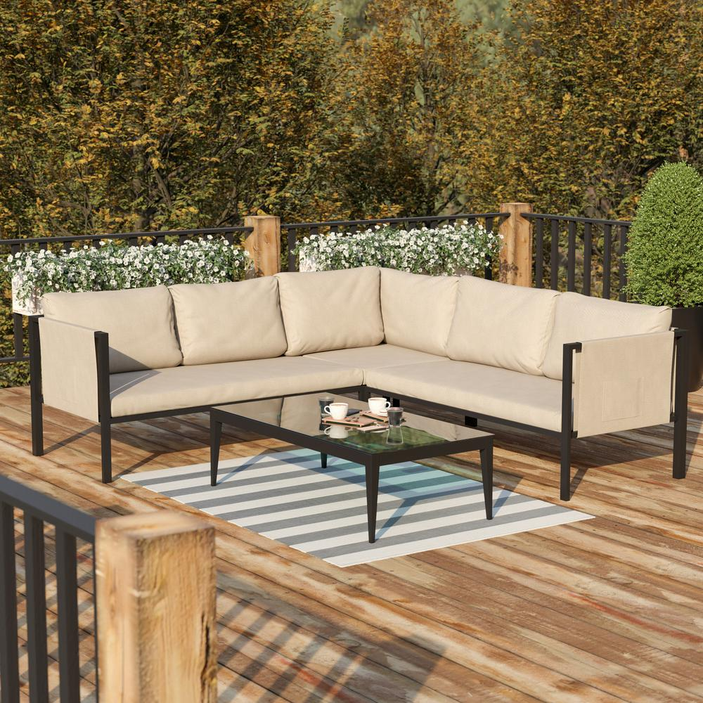Entertain friends and family on the deck or patio and meet outdoors with clients in upmarket style when you purchase this stylish sectional. Boasting a black metal frame with included Beige back and seat cushions as well as storage pockets, everything you need for ultimate relaxation is in the box. This upholstered all-weather lounge sectional with storage will add sophisticated comfort to any residential or commercial atmosphere. Whether you're taking a break from a long day or having after work drinks with your business partners, this comfortable 5 seat sofa offers enduring materials. A powder coated 18 gauge steel frame is weather-resistant to withstand the rigors of year-round use however, care should be taken to protect from prolonged periods of wet weather. Sturdy metal screw reinforcements allow this sectional to hold up to 1300 lbs. of static weight to accommodate most users. Storage pockets on both sides of this multipurpose sectional allow you to keep remote controls, reading glasses, or informational pamphlets within reach. Assemble your new sectional in an hour or less with included materials. Durable fabric cushions are zippered for removal and may be spot cleaned with water and a dry cloth. Fixed plastic floor glides protect your hard flooring surfaces when used indoors. Purchase our matching steel framed chairs and loveseats to hold staff meetings or a relaxed space for the whole family to gather.