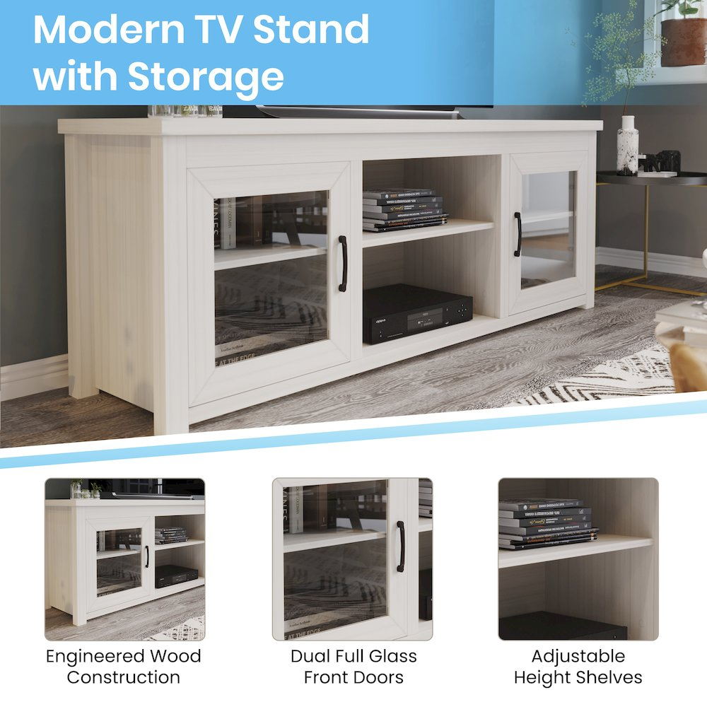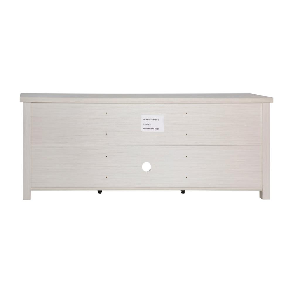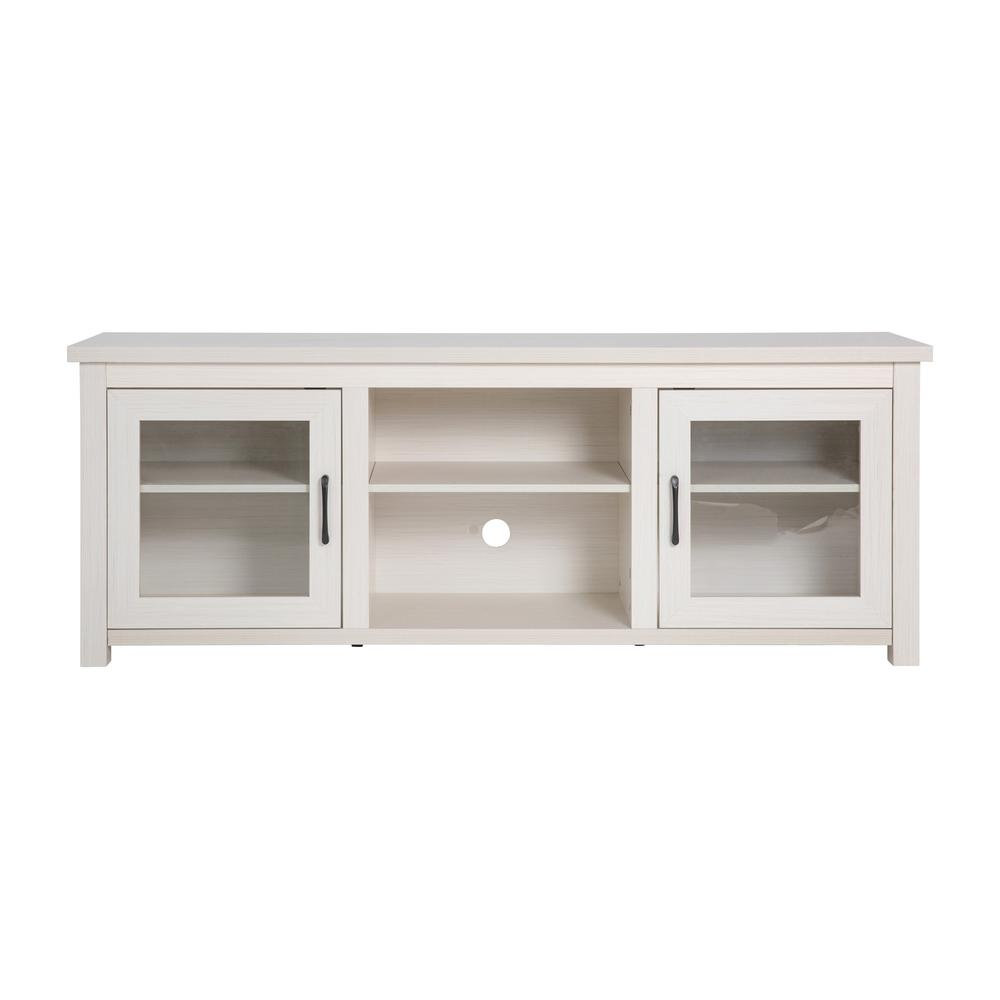 65" Entertainment Center with Storage Cabinets for up to 80" TV's White Wash Finish suitable for any décor Dual Glass Door Cabinets provide ample storage Long-Lasting Engineered Wood Composition for enduring use Top Shelf Holds up to 200 Lbs. Static Weight Capacity to safeguard valuable devices and décor Middle Shelf Size: 20"W x 13.75"D; Cabinet Shelf Size (2): 19"W x 13.75"D; 30 Lb. Static Weight Cable Management Cutout keeps cords under control Fixed Plastic Floor Glides prevent damage to hard flooring surfaces Assembles in 60 Minutes or Less with Step-by-Step Illustrated Instructions Entertainment center ideal for living room, family room, entryway, or bedroom use