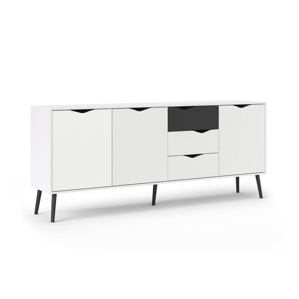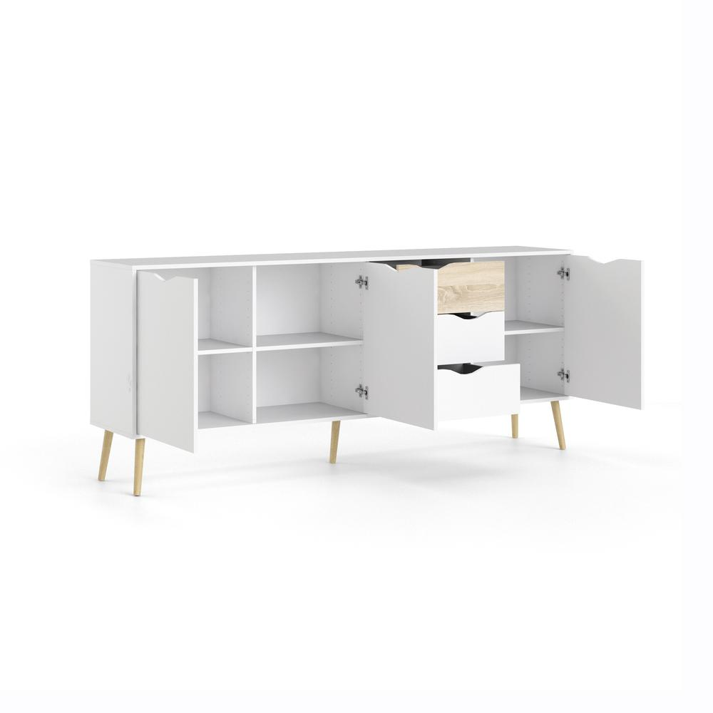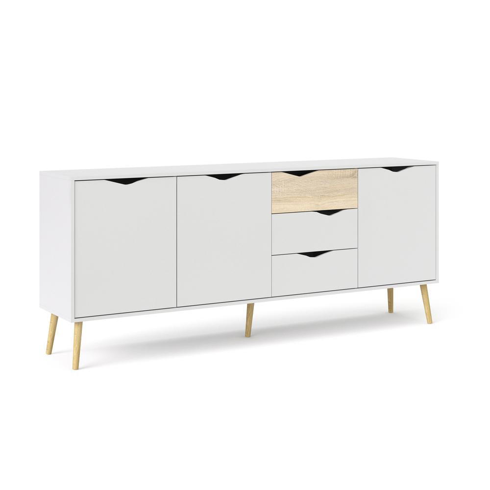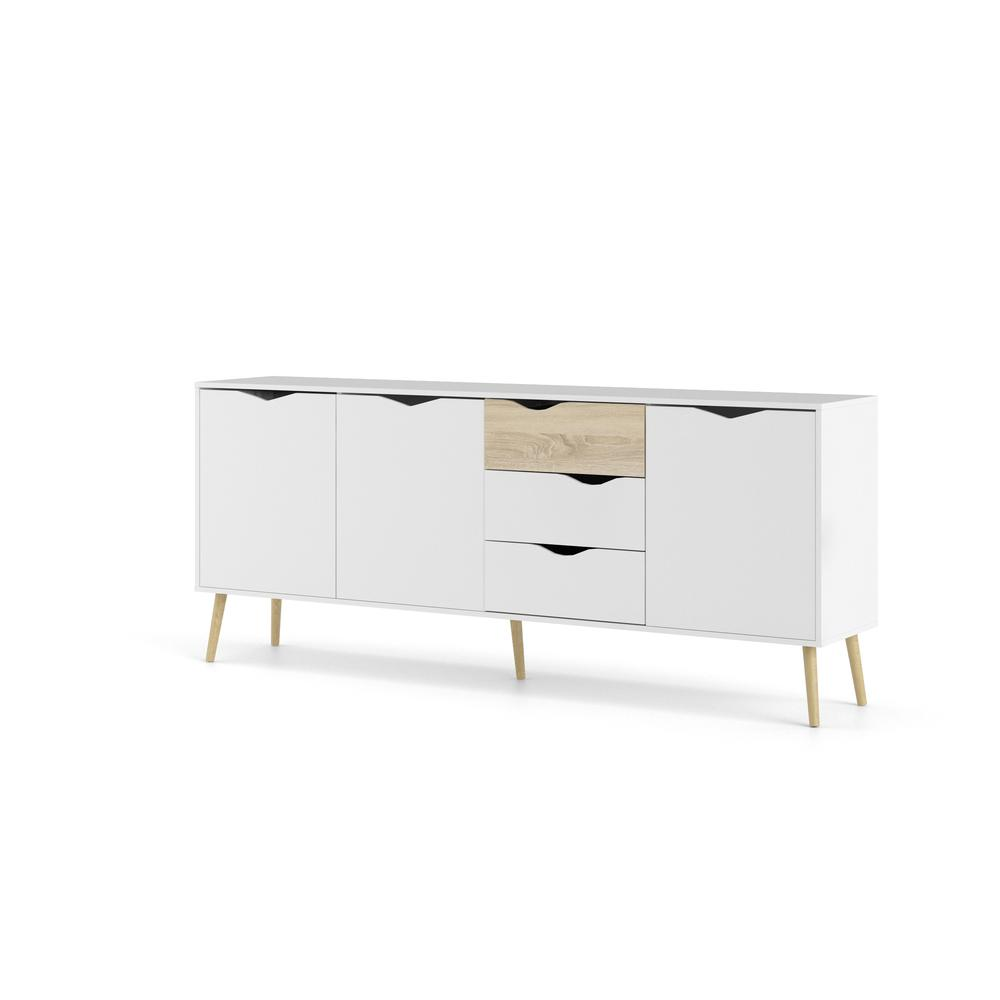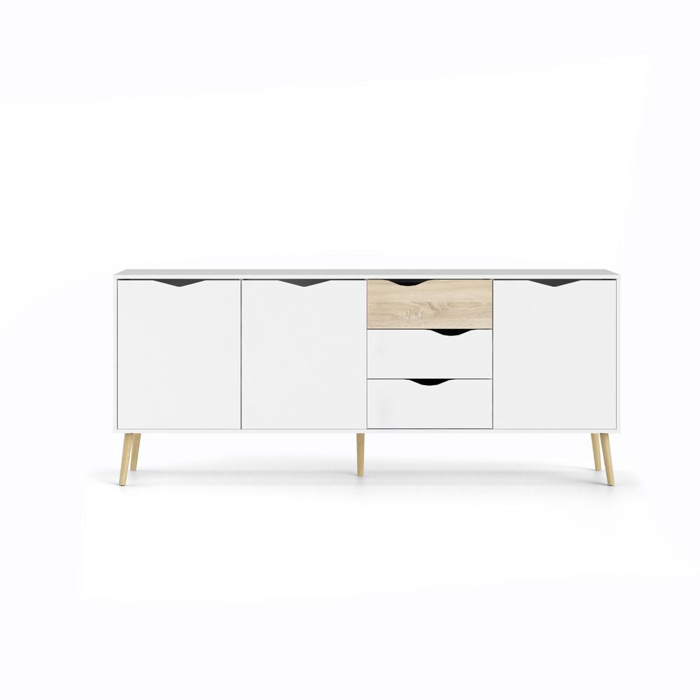 Give your living space an instant update with the Diana Sideboard with 3 Doors and 3 Drawers. It offers authentic Scandinavian design with clean lines and a modern two-tone finish. This sideboard is ideal for any living space that needs storage featuring three drawers and three doors with grooved cut out handles. The sideboard has ample room without being short on style with the light and airy color combination of a crisp white top with wood tapered, round legs perfects this fresh interpretation of mid century design. This Diana Sideboard with 3 Doors and 3 Drawers is also easy to wipe clean and resists scratching to keep it looking new longer. Complete your living space with other items from the Diana collection.