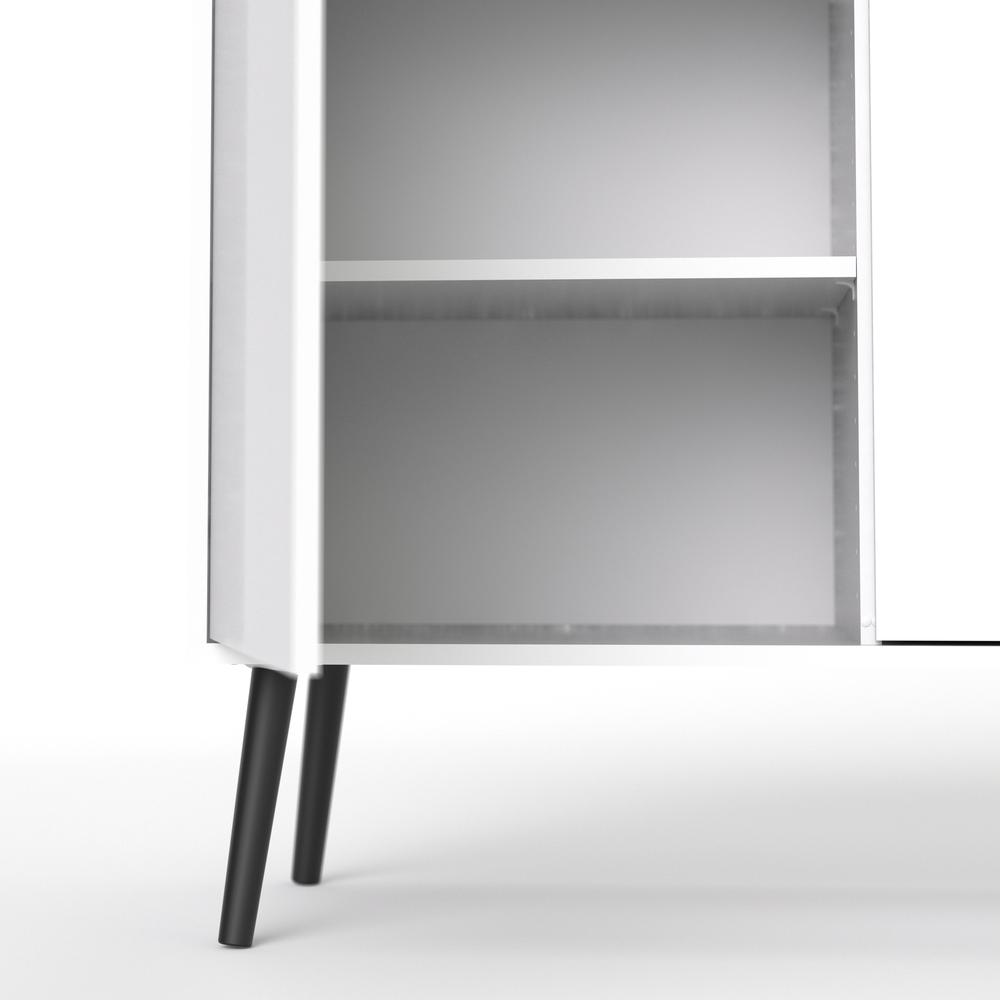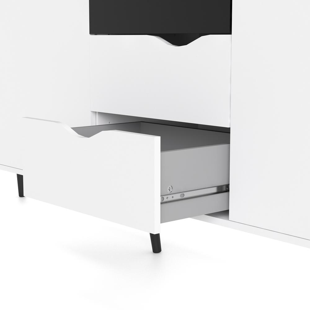 Classic design in a modern interpretation Two-tone finish combination Three drawers, three doors and three adjustable shelves Cut-out drawer and door pulls in place of handles, Drawers retract smoothly on metal glides Round, flared legs made with solid wood