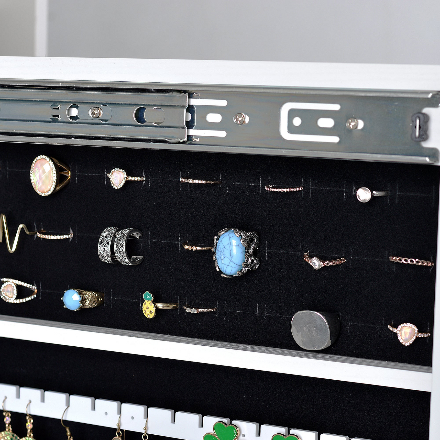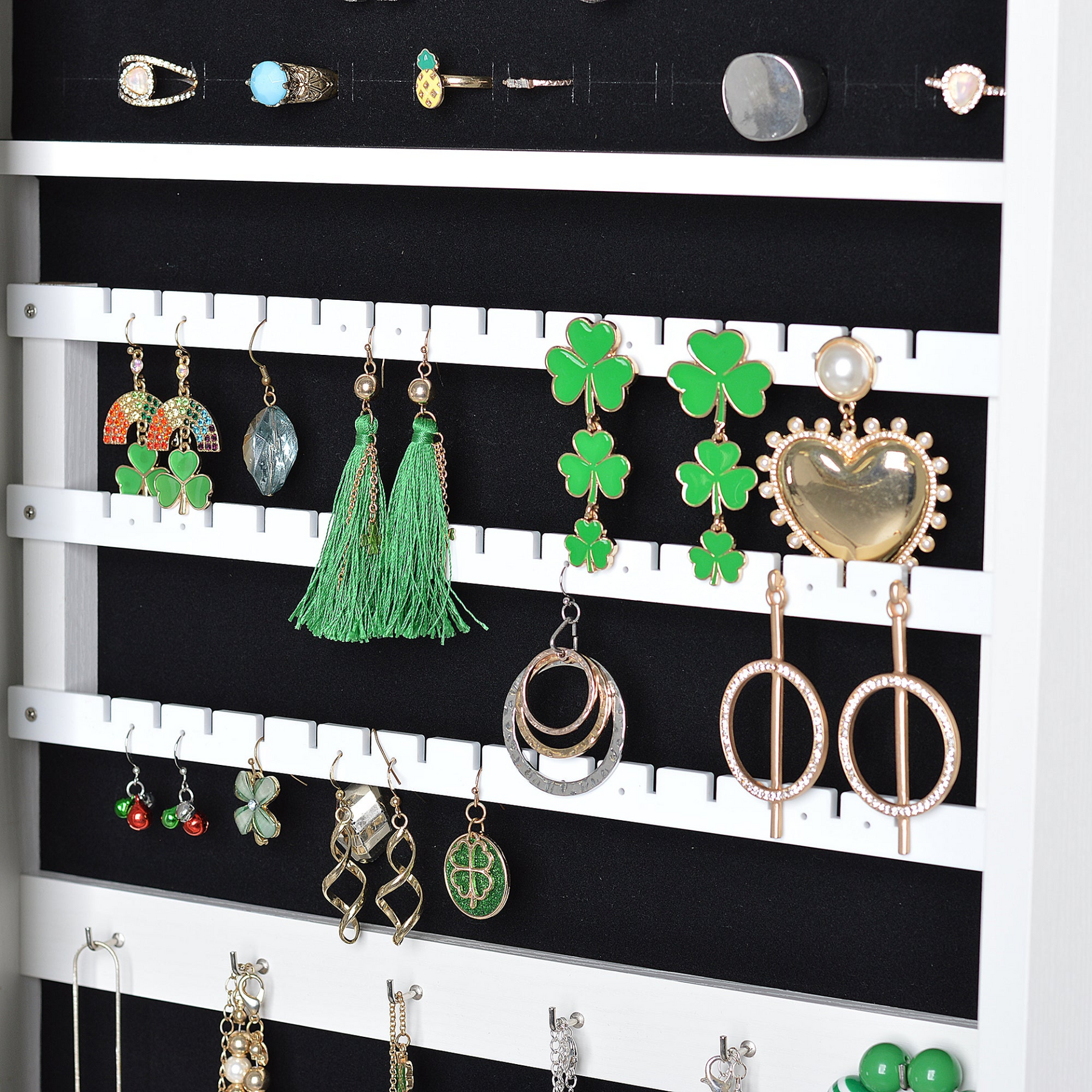 - Ample storage:includes 22 necklace hooks,2 cubes,4 lined shelves and a bracelet rod,and plenty of room for rings and eqrrings.it can hold on the door or wall.