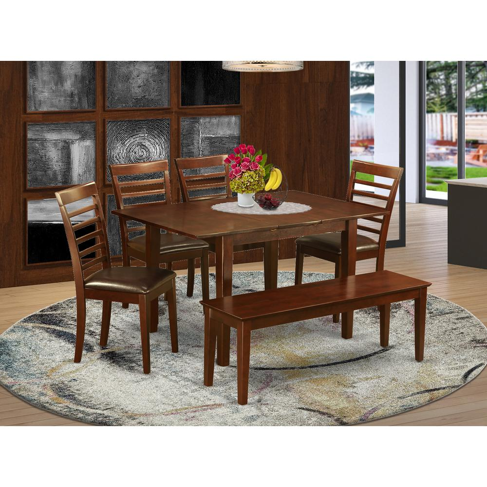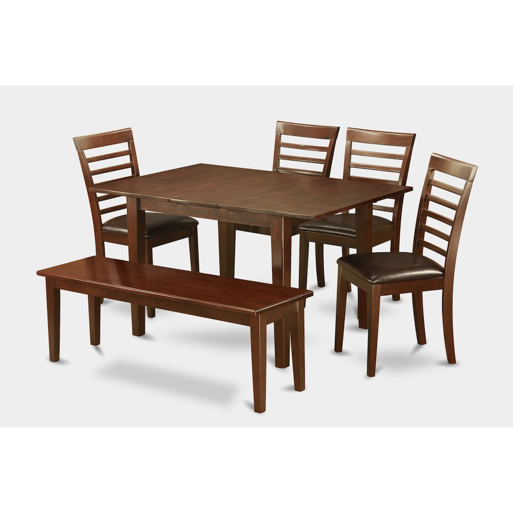 6 Piece Dining table set with Rectangular Dining room table provides 12 in butterfly leaf and 4 faux leather seat chairs plus one 52 in long dining bench with wood seat. Table Dimensions: Length 42 / 54; Width 36; Height 29.5. Chair Dimensions: Length 17; Width 16.5; Height 37. Bench Dimension: Length 52; Width 16; Height 18. Luxury dining set which containing all Asian Hardwood. Absolutely no MDF, veneer, laminate in our products. Small dinette table comes with 12In self storage extendable leaf Which Can Be Stored Right Below Table Top