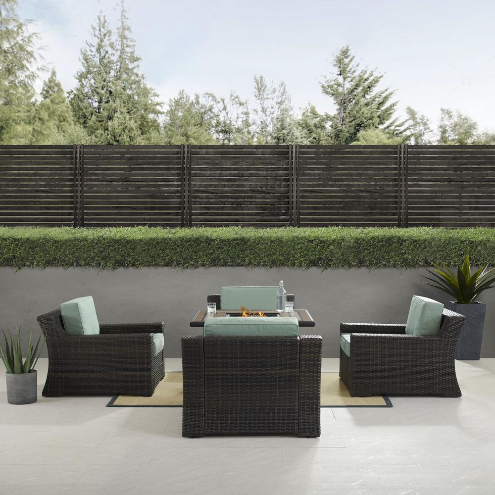 TRADITIONAL PATIO FURNITURE: This 5-piece chair set features handwoven multi-tone brown flat wicker over weather-resistant powder-coated steel frames. The UV-resistant all-weather resin wicker ensures that this chair set maintains its beauty. ULTIMATE COMFORT: The patio chairs feature 5" thick seat cushions and 6" thick back cushions. The mist-colored cushions have moisture-resistant high-grade cores, plus removable solution-dyed polyester covers that are washable and weather-resistant. The 50,000 BTU fire table has a tiled-stone top and uses a 20lb propane tank (not included). It includes a lid, 10 lbs of black glass fire beads, plus covers for the table and propane tank. AAA battery for the ignitor is not included. Perfect for balconies and porches, this set includes four patio chairs(31.5"H x 37"W x 37"D) and a fire table (40.25"W x 40.25"D x 25.5"H) with a 50lb weight capacity. The set's adjustable levelers ensure stability on any surface. AMERICAN LEGACY: Inspired by over 100 years of the Crosley legacy, Crosley Furniture offers style for every space, from retro to modern. Crosley products are proudly designed in the USA and come with USA-based customer support. UV resistant all-weather resin wicker Weather-resistant powder-coated steel frame High-performance solution-dyed polyester cushion covers resist sun fade and abrasion to keep your outdoor patio furniture looking good Moisture-resistant high grade cushion cores 5" thick seat cushion and 6" thick back cushion Fire table has a tiled stone top Fire table gas controls and propane tank store inside table The fire table comes with a lid and protective covers for the table and propane tank (Propane tank not included), plus 10lbs of black glass fire beads