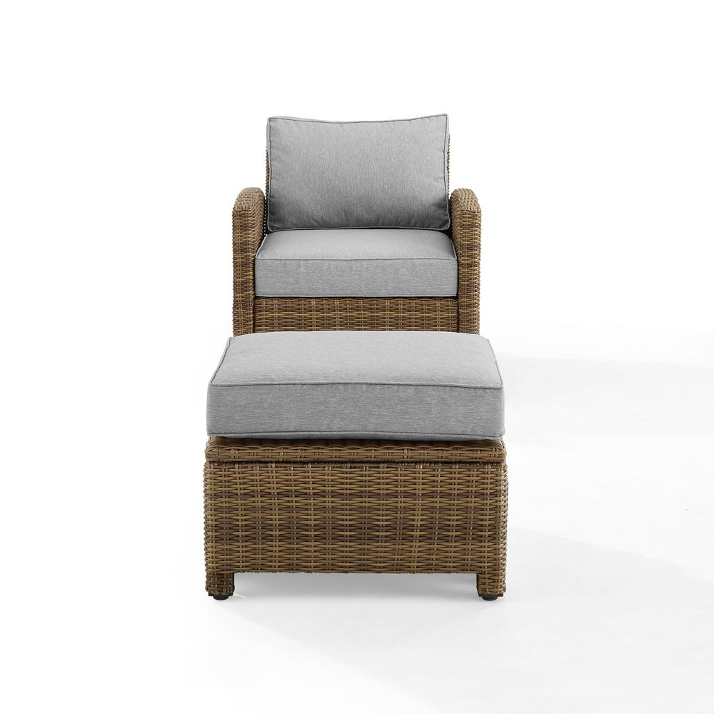 TRADITIONAL OUTDOOR FURNITURE: Built to endure the elements, this chair and ottoman set has a weather-resistant powder-coated steel frame and handwoven UV-resistant all-weather half-round resin wicker in a weathered brown finish. RELAX IN COMFORT: The patio chair and ottoman have 5" thick seat cushions, plus the chair has 4" thick back cushions. The gray cushions have moisture-resistant cores and covers made from solution-dyed polyester that resists sun fade and abrasion. EASY CARE: The removable cushion covers are machine washable, making it easy to keep your outdoor furniture looking fresh. Adjustable levelers on all the legs ensure stability on uneven surfaces. PERFECT FOR OUTDOOR LIVING: This 2pc wicker chair set can be used as balcony furniture or porch furniture. It has a traditional design and includes a wicker armchair (30.5"W x 35'D x 32.5"H) and an outdoor ottoman (25"W x 20"D x 18.5"H). AMERICAN LEGACY: Inspired by over 100 years of the Crosley legacy, Crosley Furniture offers style for every space, from retro to modern. Crosley products are proudly designed in the USA and come with USA-based customer support. UV resistant all-weather half-round resin wicker with rattan look Weather-resistant powder-coated steel frame Gray outdoor cushion covers High-performance solution-dyed polyester cushion covers resist sun fade and abrasion to keep your outdoor patio furniture looking good Moisture-resistant high grade cushion cores Anti-slip pads on the ottoman cushion covers prevent slippage Removable cushion covers are machine washable 5" thick seat cushion and 4" thick back cushion