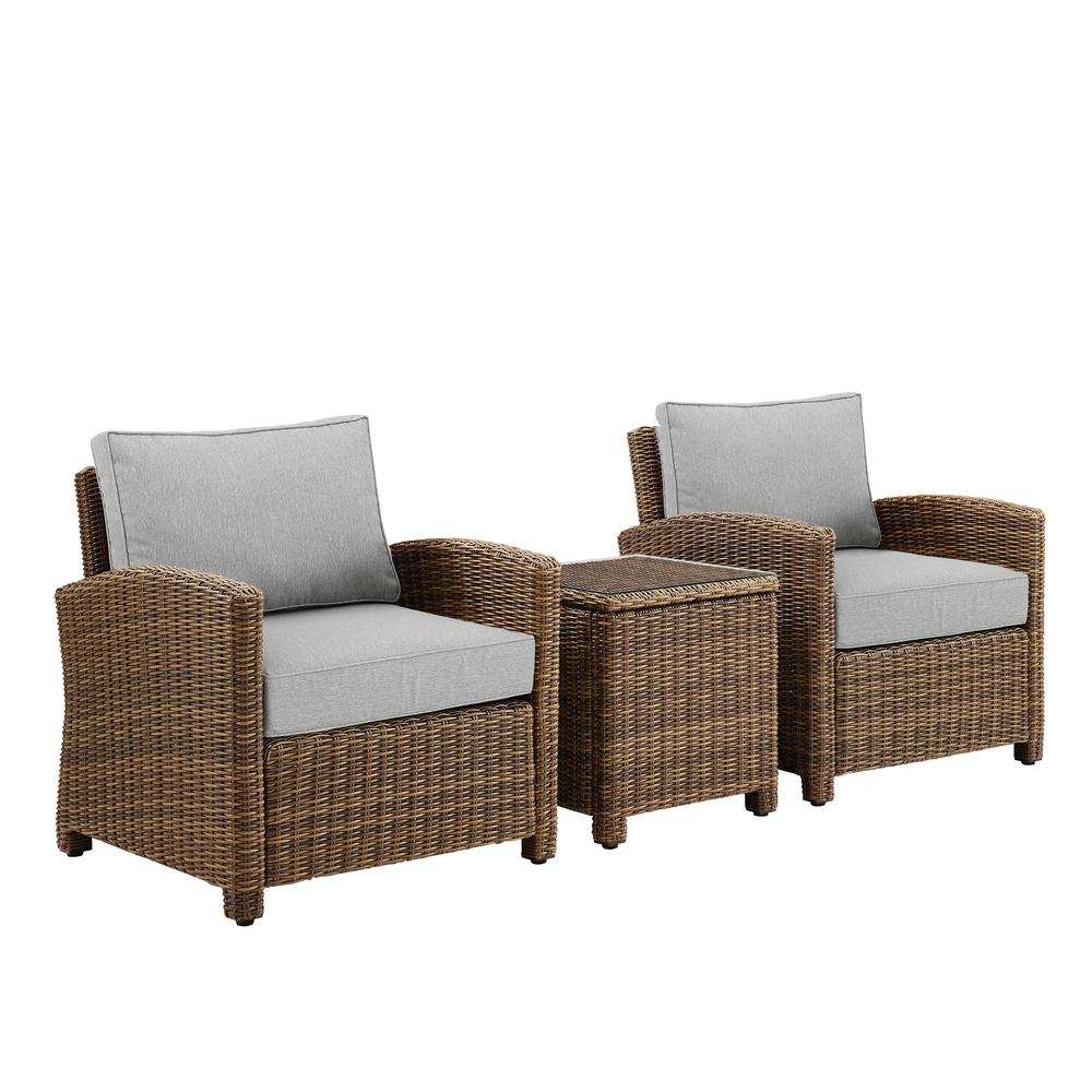 TRADITIONAL OUTDOOR FURNITURE: Built to endure the elements, this patio chair set has a weather-resistant powder-coated steel frame and handwoven UV-resistant all-weather half-round resin wicker in a weathered brown finish. RELAX IN COMFORT: This set has 5" thick seat cushions and 4" thick back cushions with moisture-resistant cores. The gray outdoor cushion covers are made from solution-dyed polyester, which resists sun fade and abrasion, ensuring long-lasting beauty. EASY CARE: Outdoor furniture care is easy thanks to the removable machine-washable cushion covers. The patio table includes a tempered glass top for quick cleaning, while adjustable levelers on the legs ensure stability on uneven surfaces. This patio chair set is ideal for your porch or balcony and provides seating for up to two people. The set includes two chairs (30.5"W x 31.75"D x 32.5"H) and a side table (20" x 20"D x 21.25"H) with a weight limit of 25 lbs. AMERICAN LEGACY: Inspired by over 100 years of the Crosley legacy, Crosley Furniture offers style for every space, from retro to modern. Crosley products are proudly designed in the USA and come with USA-based customer support. UV resistant all-weather half-round resin wicker Weather-resistant powder-coated steel frame Gray outdoor cushion covers High-performance solution-dyed polyester cushion covers resist sun fade and abrasion to keep your outdoor patio furniture looking good Moisture-resistant high grade cushion cores Removable cushion covers are machine washable Adjustable levelers on legs Tempered glass tabletop