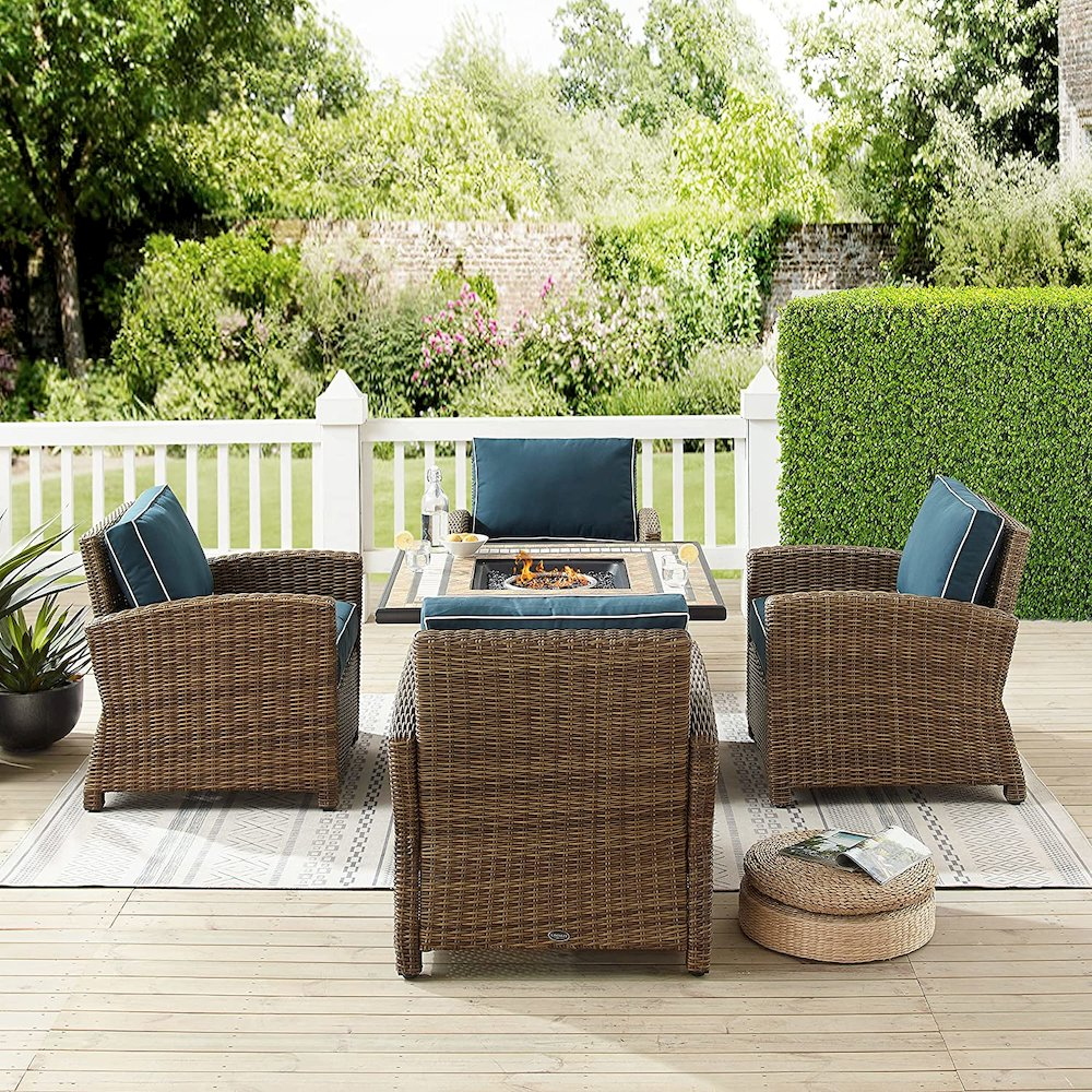 TRADITIONAL OUTDOOR FURNITURE: Built to endure the elements, this patio chair set has a weather-resistant powder-coated steel frame and handwoven UV-resistant all-weather half-round resin wicker in a weathered brown finish. This set features 5" thick seat cushions and 4" thick back cushions with moisture-resistant cores. The navy cushion covers with white piping are made from high-performance solution-dyed polyester, which resists sun fade and abrasion. The 50,000 BTU fire table has a tiled-stone top and uses a 20lb propane tank (not included). It includes a lid, 10 lbs of black glass fire beads, plus covers for the table and propane tank. AAA battery for the ignitor is not included. PERFECT FOR OUTDOOR LIVING: This outdoor furniture set offers seating for up to four. The set includes four outdoor armchairs (30.5"W x 31.75"D x 32.5"H) and a fire table (40.25"W x 40.25"D x 25.5"H). AMERICAN LEGACY: Inspired by over 100 years of the Crosley legacy, Crosley Furniture offers style for every space, from retro to modern. Crosley products are proudly designed in the USA and come with USA-based customer support. UV resistant all-weather half-round resin wicker Weather-resistant powder-coated steel frame Navy outdoor cushion covers with contrast white piping High-performance solution-dyed polyester cushion covers resist sun fade and abrasion to keep your outdoor patio furniture looking good Moisture-resistant high grade cushion cores Removable cushion covers are machine washable Fire table has a tiled stone top The fire table uses a standard 20lb propane tank (Not Included), gas controls, and propane tank store inside the table