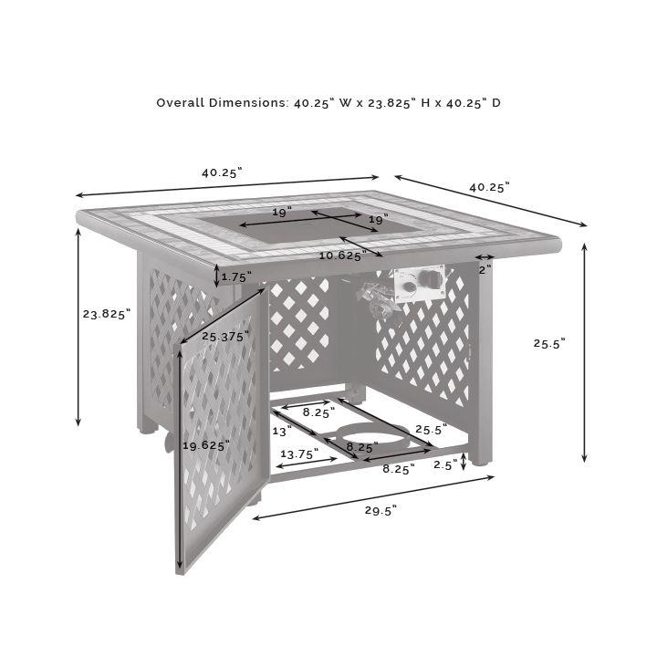 TRADITIONAL OUTDOOR FURNITURE: Built to endure the elements, this patio chair set has a weather-resistant powder-coated steel frame and handwoven UV-resistant all-weather half-round resin wicker in a weathered brown finish. This set features 5" thick seat cushions and 4" thick back cushions with moisture-resistant cores. The sangria cushion covers with white piping are made from high-performance solution-dyed polyester, which resists sun fade and abrasion. The 50,000 BTU fire table has a tiled-stone top and uses a 20lb propane tank (not included). It includes a lid, 10 lbs of black glass fire beads, plus covers for the table and propane tank. AAA battery for the ignitor is not included. PERFECT FOR OUTDOOR LIVING: This outdoor furniture set offers seating for up to four. The set includes four outdoor armchairs (30.5"W x 31.75"D x 32.5"H) and a fire table (40.25"W x 40.25"D x 25.5"H). AMERICAN LEGACY: Inspired by over 100 years of the Crosley legacy, Crosley Furniture offers style for every space, from retro to modern. Crosley products are proudly designed in the USA and come with USA-based customer support. UV resistant all-weather half-round resin wicker Weather-resistant powder-coated steel frame Deep sangria outdoor cushion covers with white piping High-performance solution-dyed polyester cushion covers resist sun fade and abrasion to keep your outdoor patio furniture looking good Moisture-resistant high grade cushion cores Removable cushion covers are machine washable Fire table has a tiled stone top The fire table uses a standard 20lb propane tank (Not Included), gas controls, and propane tank store inside the table