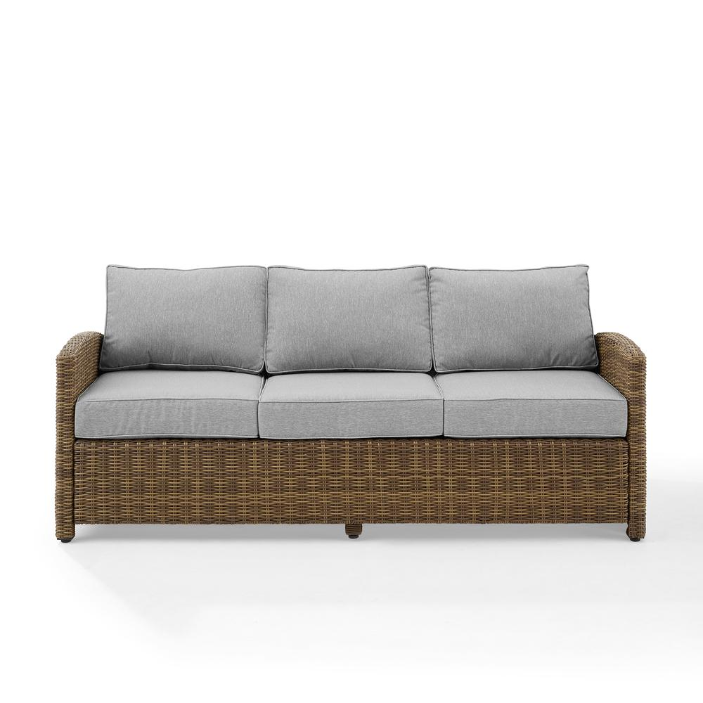 TRADITIONAL OUTDOOR FURNITURE: Built to endure the elements, this patio sofa has a weather-resistant powder-coated steel frame and handwoven UV-resistant all-weather half-round resin wicker in a weathered brown finish. RELAX IN COMFORT: This outdoor sofa features 5" thick seat cushions and 4" thick back cushions with moisture-resistant cores. The gray outdoor cushion covers are made from high-performance solution-dyed polyester, which resists sun fade and abrasion. EASY CARE: The removable cushion covers are machine washable, making it easy to maintain a clean and inviting outdoor space. PERFECT FOR OUTDOOR LIVING: This patio sofa's traditional design blends with a variety of outdoor spaces. Whether you're lounging on your balcony or porch, this small outdoor sofa offers seating for up to three. AMERICAN LEGACY: Inspired by over 100 years of the Crosley legacy, Crosley Furniture offers style for every space, from retro to modern. Crosley products are proudly designed in the USA and come with USA-based customer support. UV resistant all-weather half-round resin wicker with rattan look Weather-resistant powder-coated steel frame Gray outdoor cushion covers High-performance solution-dyed polyester cushion covers resist sun fade and abrasion to keep your outdoor patio furniture looking good Moisture-resistant high grade cushion cores Removable cushion covers are machine washable Adjustable levelers on legs Outdoor couch provides seating for up to three
