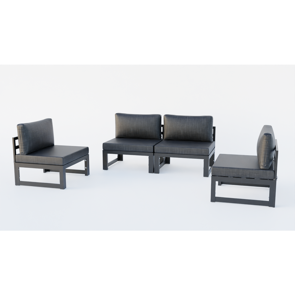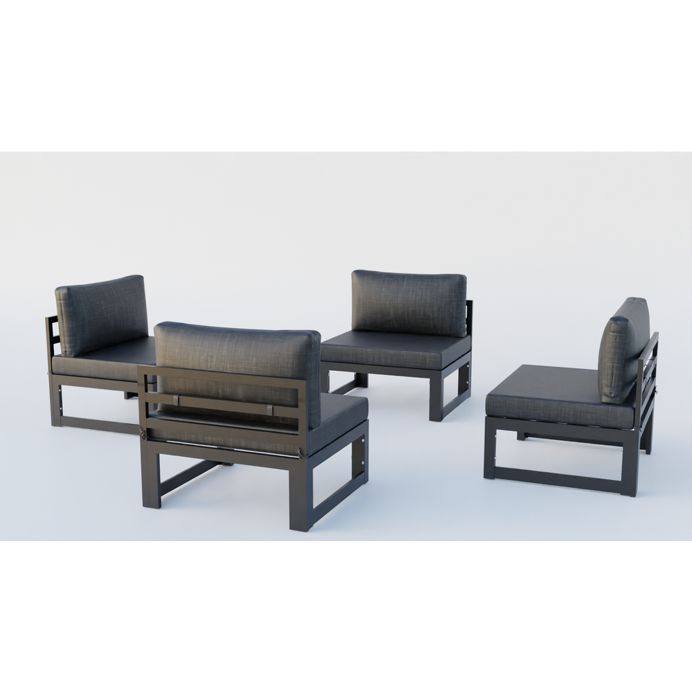 Includes 4 Armless Chairs Seat and legs are crafted of stronger than steel Aluminum for optimal durability. Clips to connect each chair together, Plastic cap floor protectors Powder-coated aluminum frame Suitable for indoor & outdoor use, Weather, Water, & Rust Resistant UV-protected from direct exposure to the sun Zippered Removable, washable cushion covers with Cushion ties Simple Assembly required.