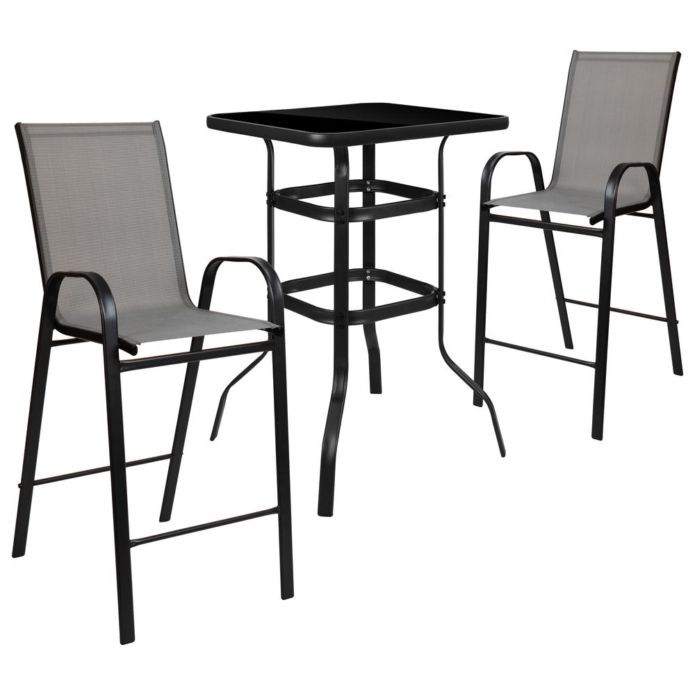 Patio Bar Table Set for 2 Square Bar Table: 27.5"W x 27.5"D x 39.5"H 5mm Clear Tempered Glass Bowed Legs with 26" Wide Base Two Sling Patio Stools: 22"W x 26"D x 50"H Breathable Textilene Fabric Upholstery Integrated Curved Arms provide support to upper body Footrest provides better sitting experience Plastic Floor Glides protect floors when used indoors Add bar dining set to your balcony, patio, deck, sunroom or kitchen